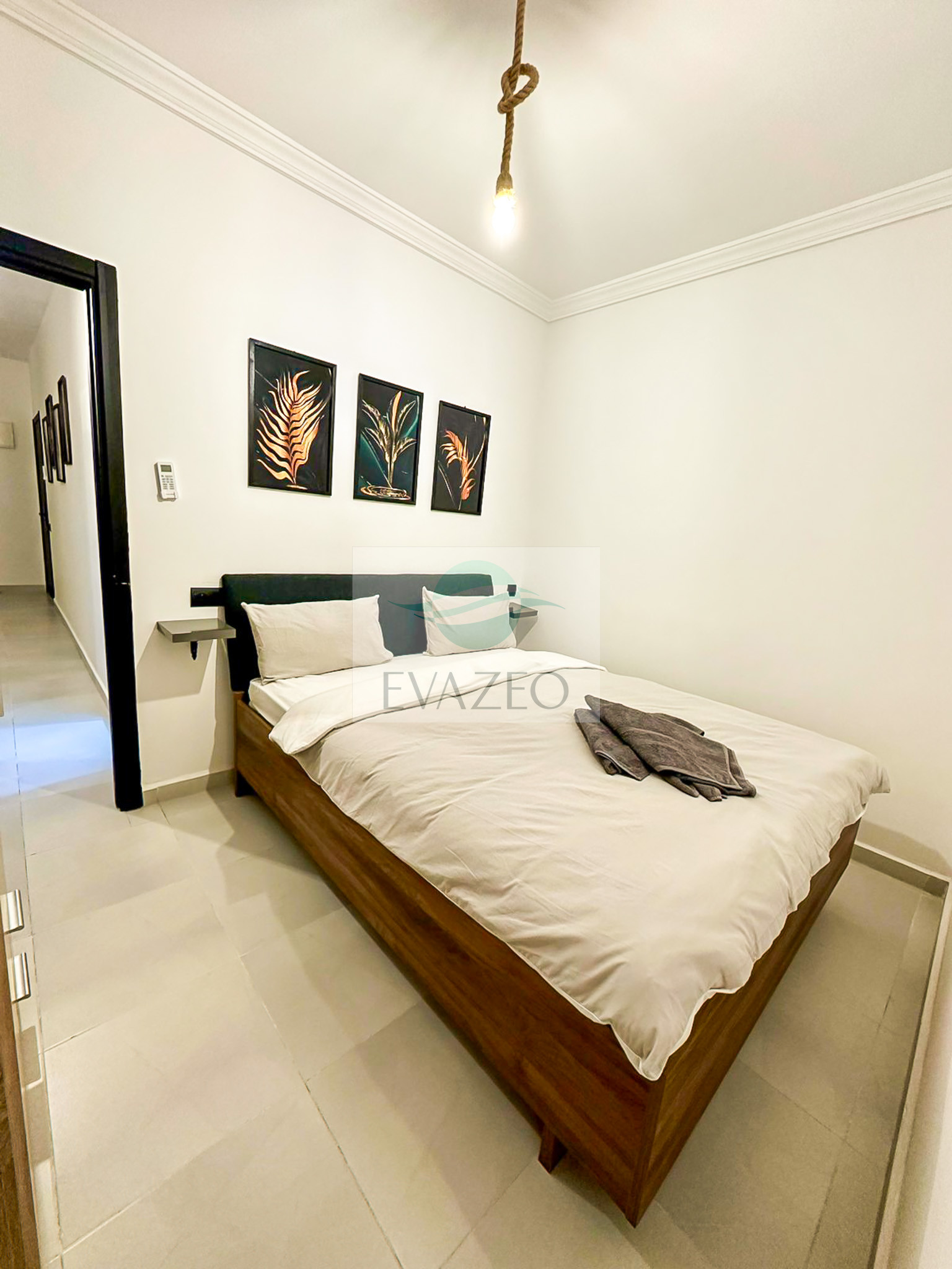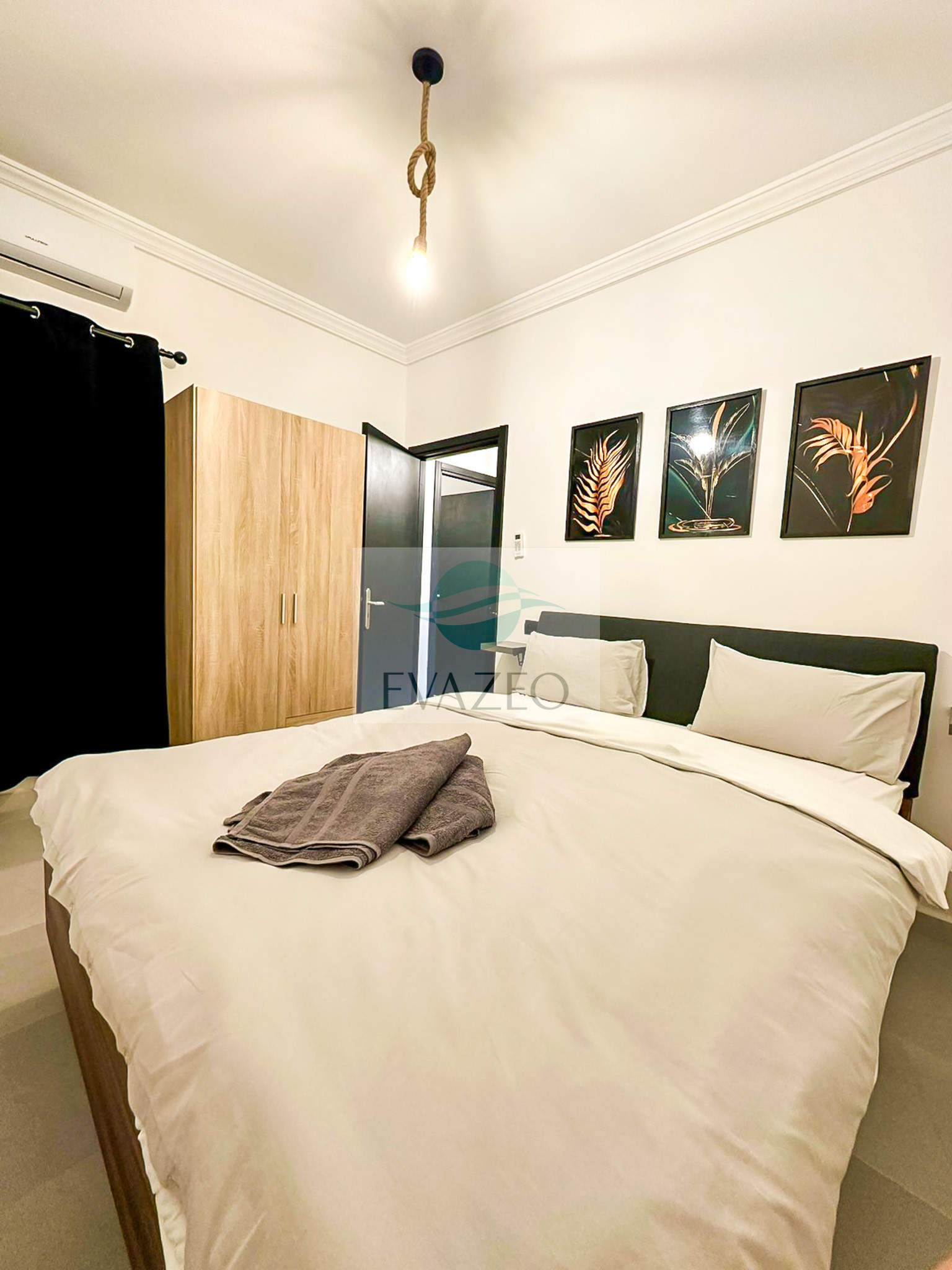 The apartment has two comfortable bedrooms, each equipped with a queen-size bed, ensuring peaceful sleep. A practical shower room completes the interior space, making the stay pleasant and functional.