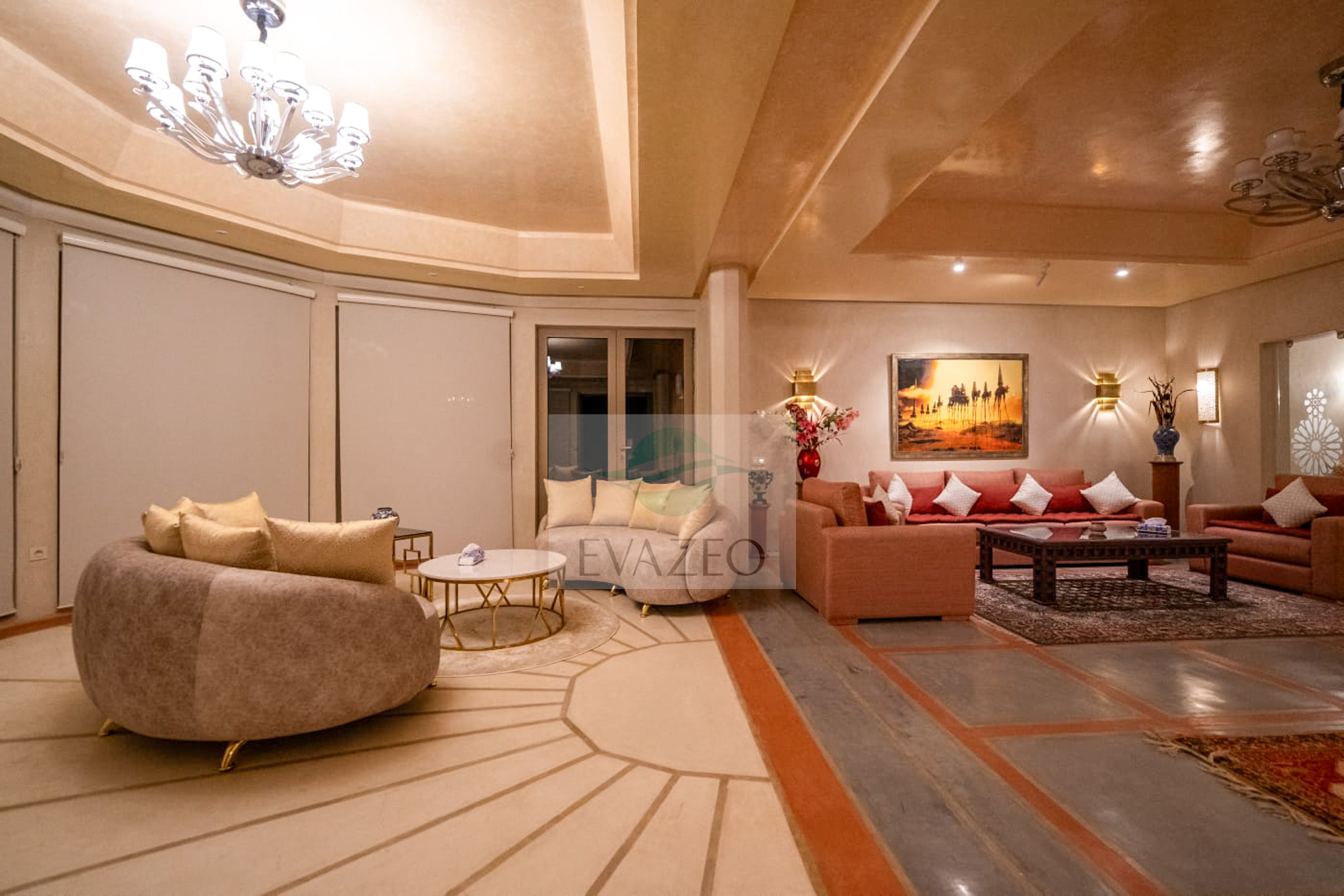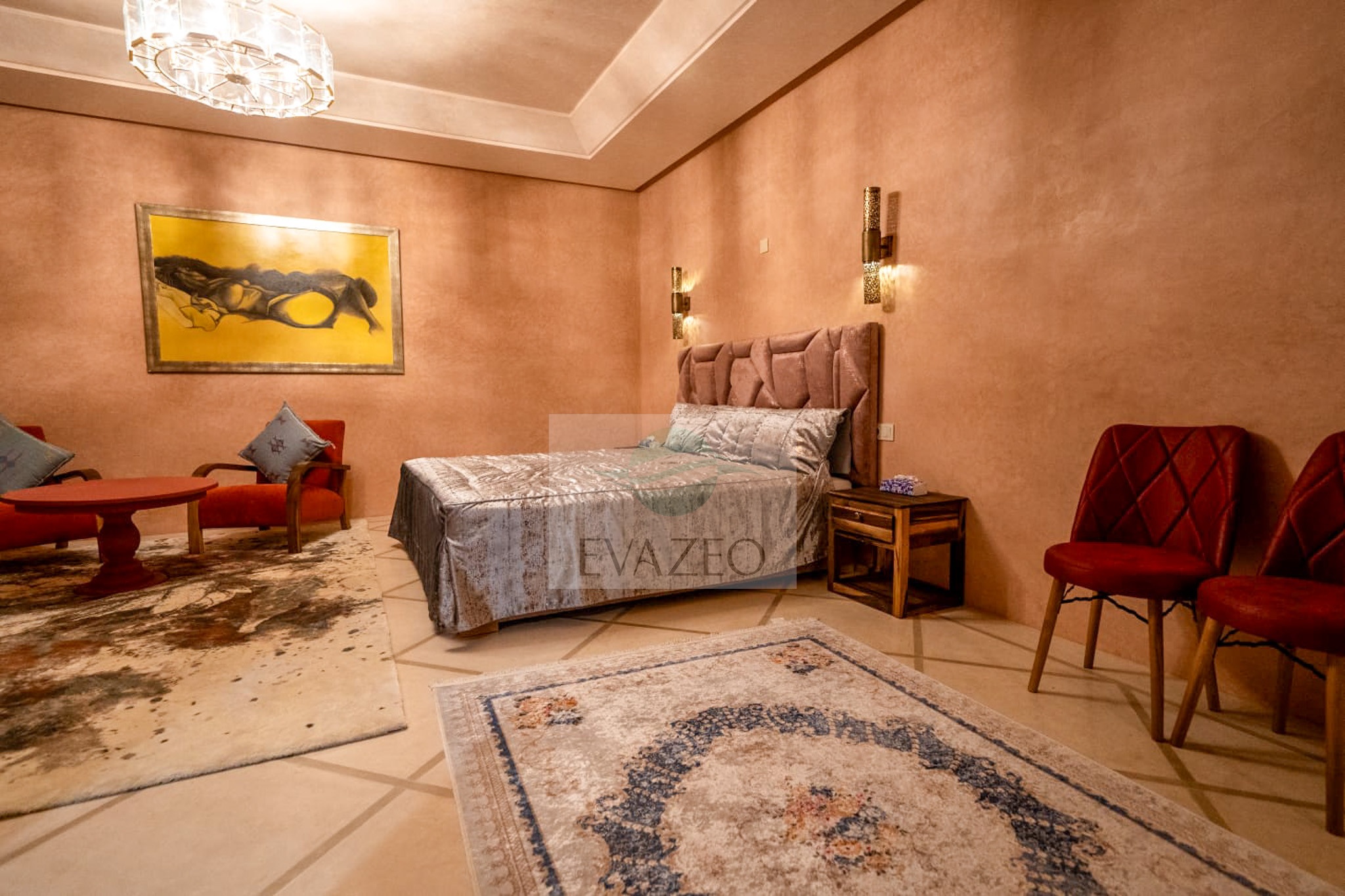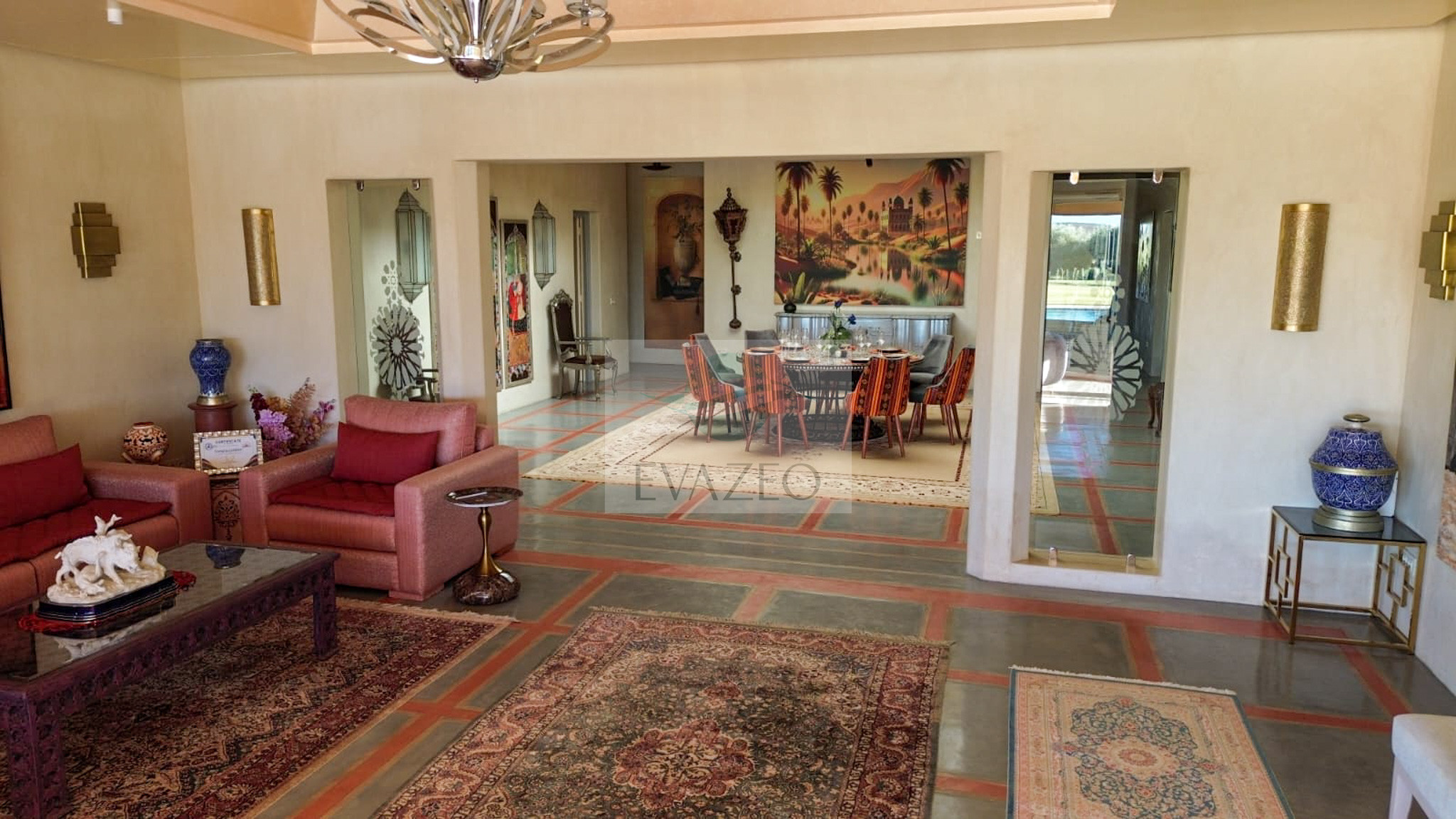The estate offers 10 spacious suites spread across two private pavilions. Each villa has its own living space with a Moroccan lounge, European lounge, dining room, panoramic glazed veranda and large-screen TV. A major asset: each pavilion has its own adjacent private pool.