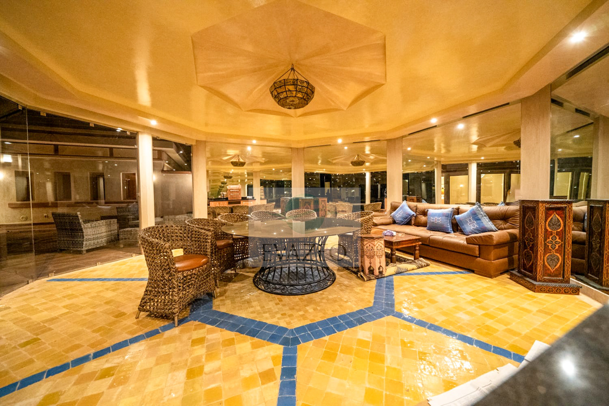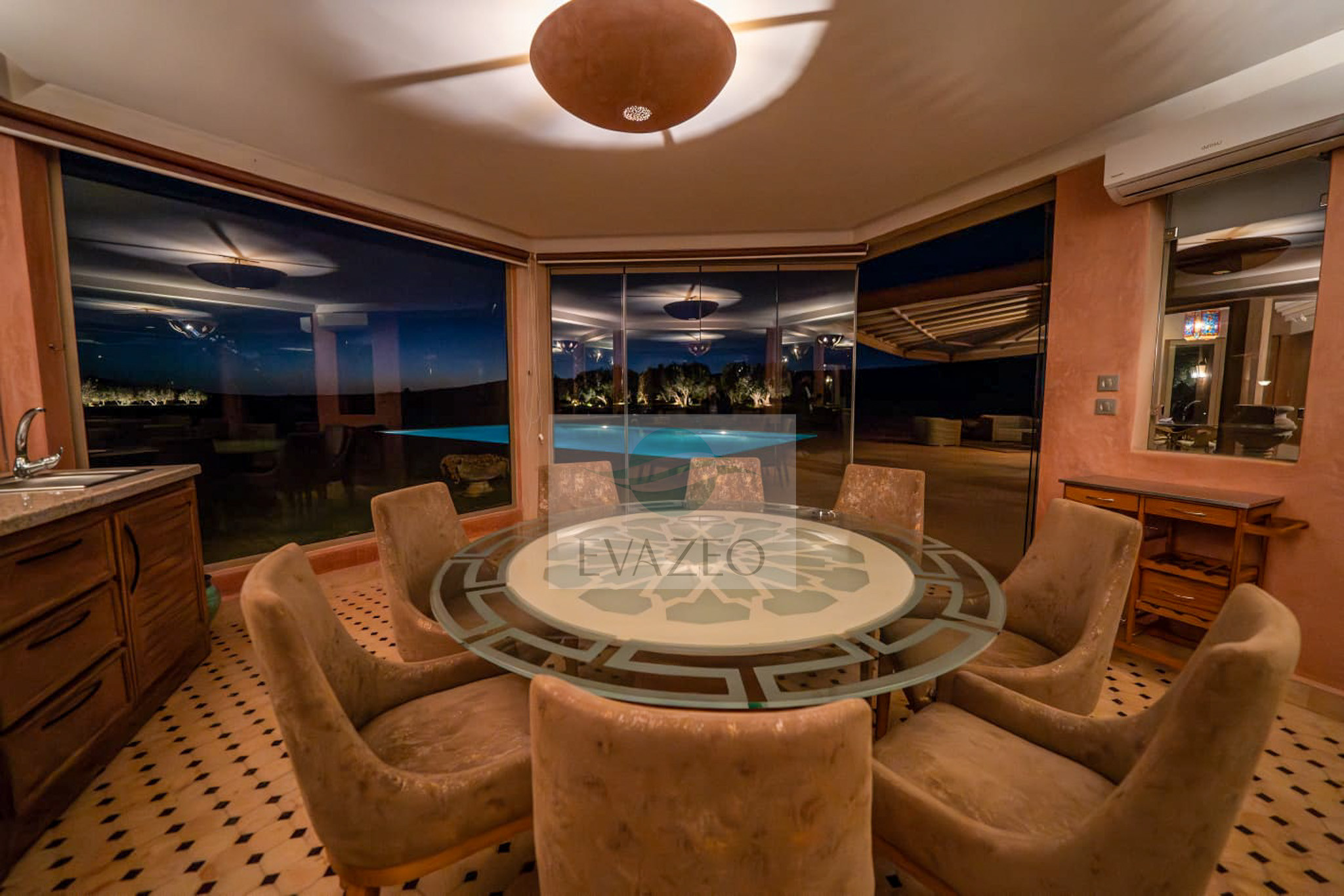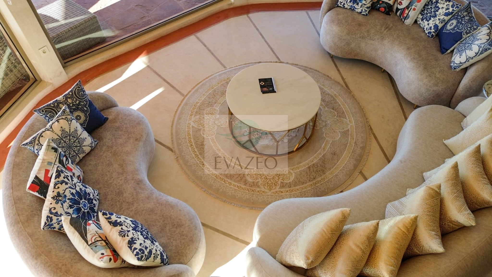 Enjoy generous living spaces: traditional Moroccan living room with fireplace and large TV screen, European living room, glazed winter lounge offering a panoramic view of the estate, fully equipped dining room and kitchen. A 24/7 guarded haven of peace, with no neighbourhood.