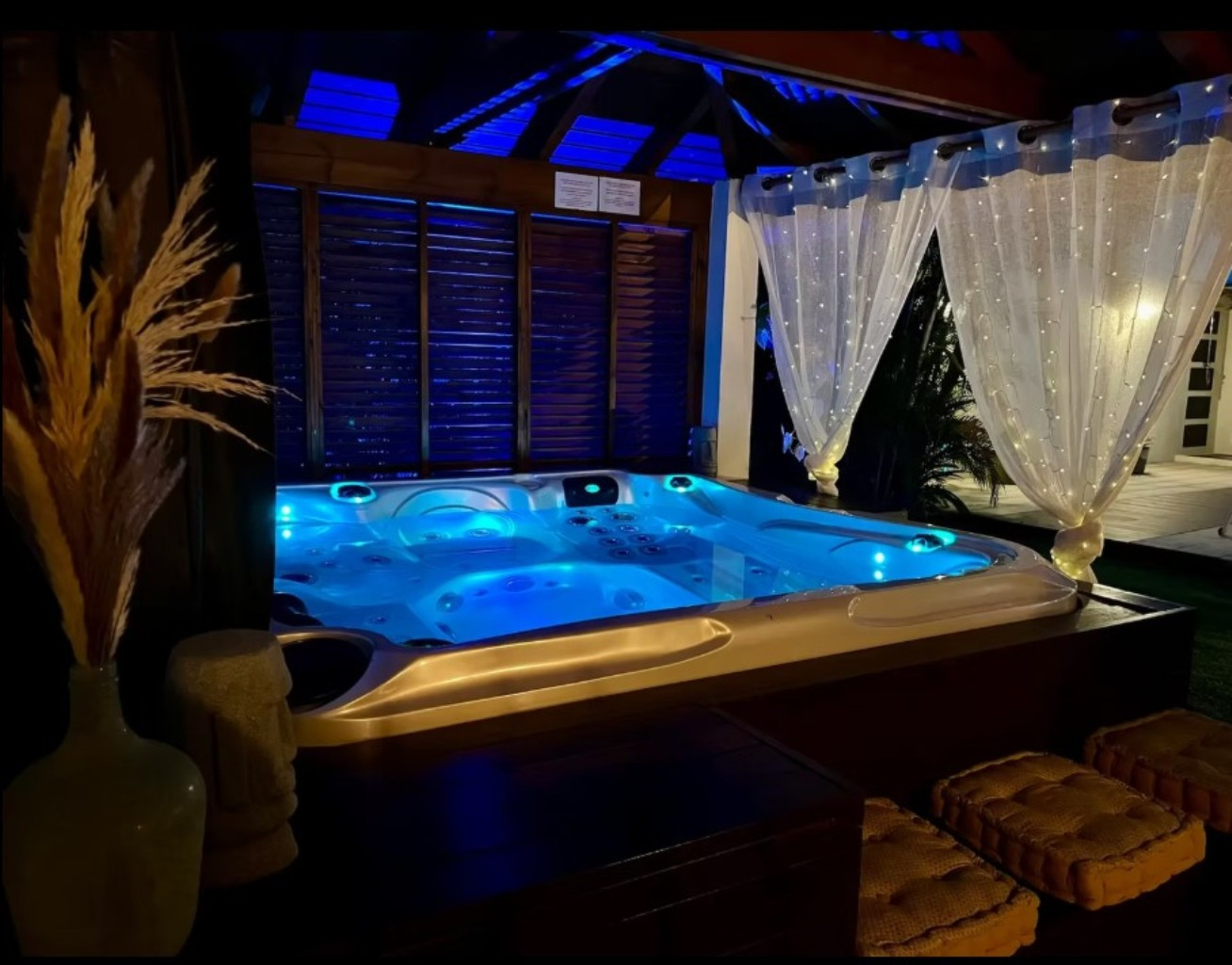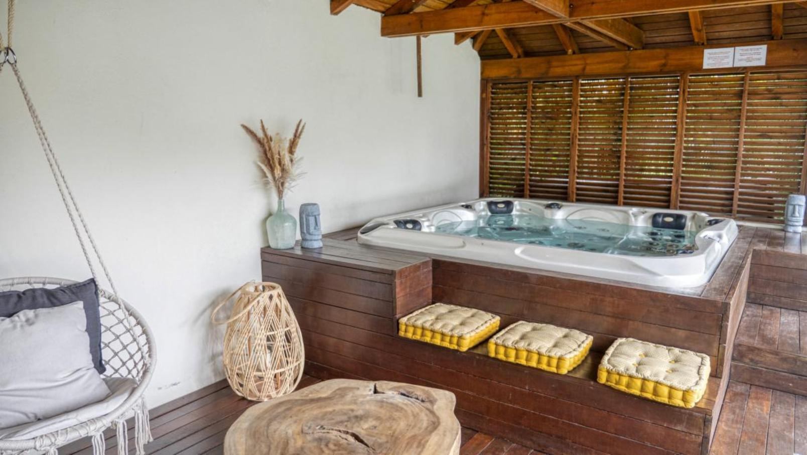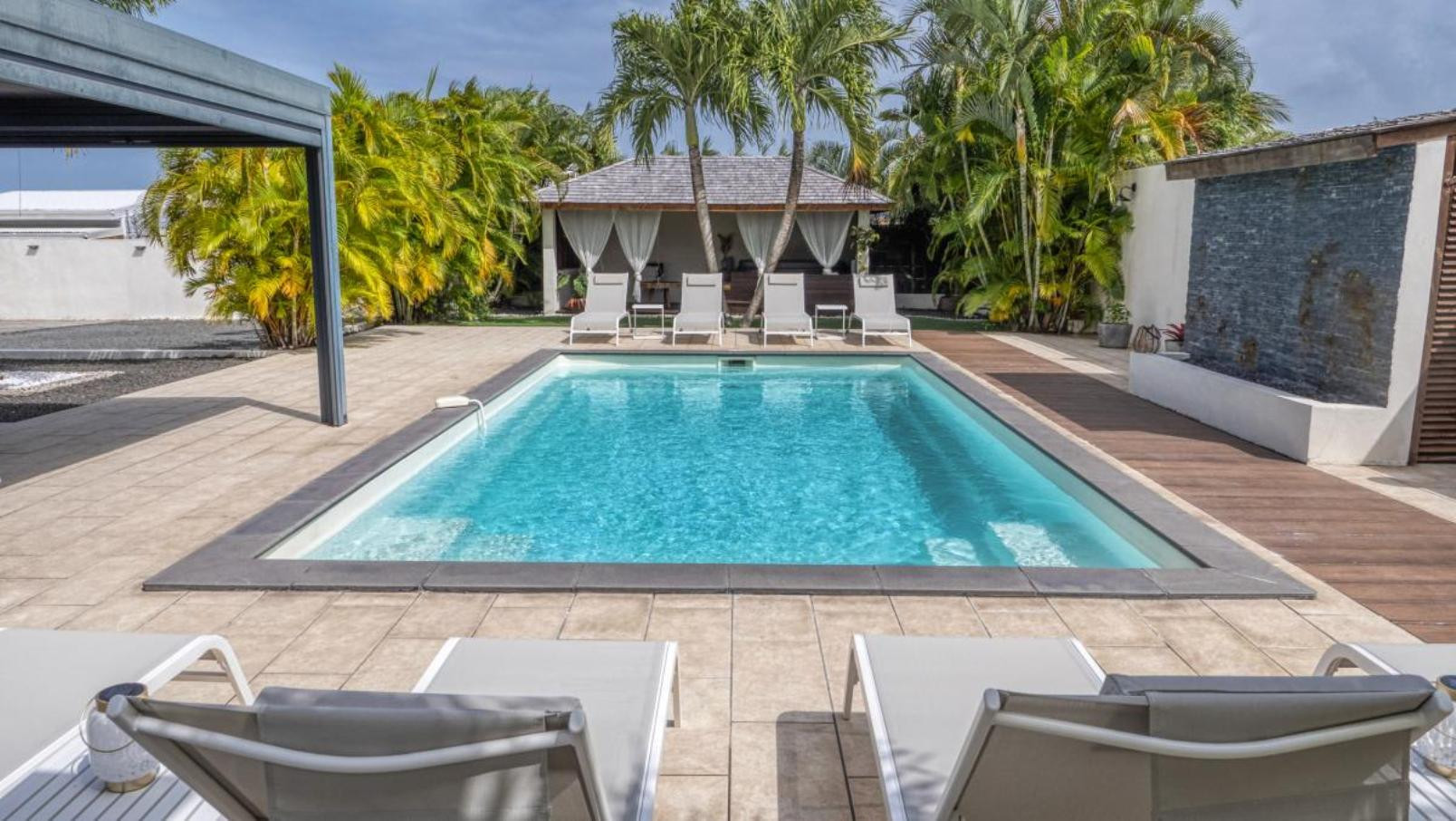 Garden/terrace: terrace of approximately 45 m² with a complete outdoor lounge for meals or relaxation. A relaxation pavilion with a family hot tub is located at the end of the pool. Night lighting will allow you to spend your evenings in a magical setting.