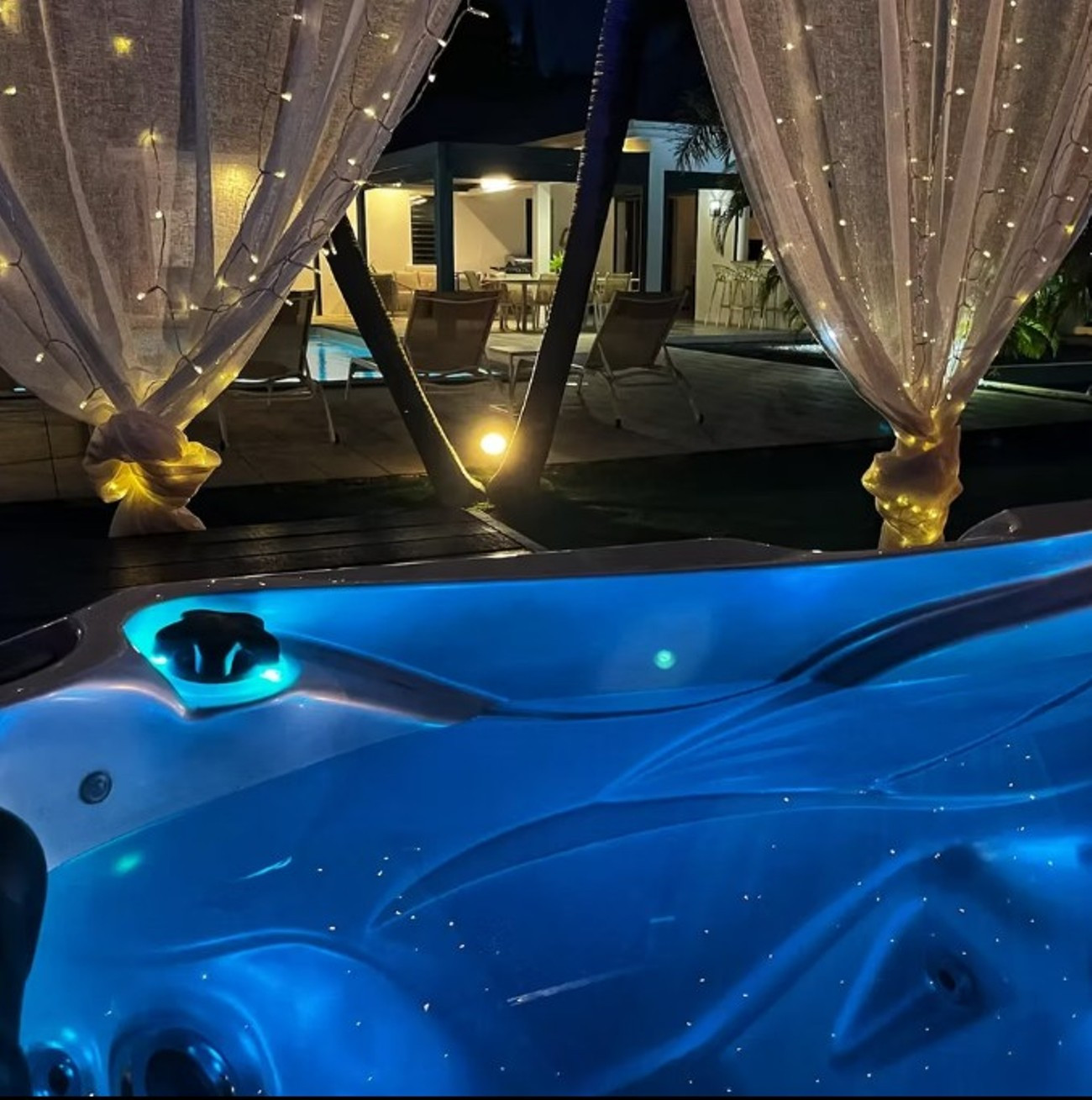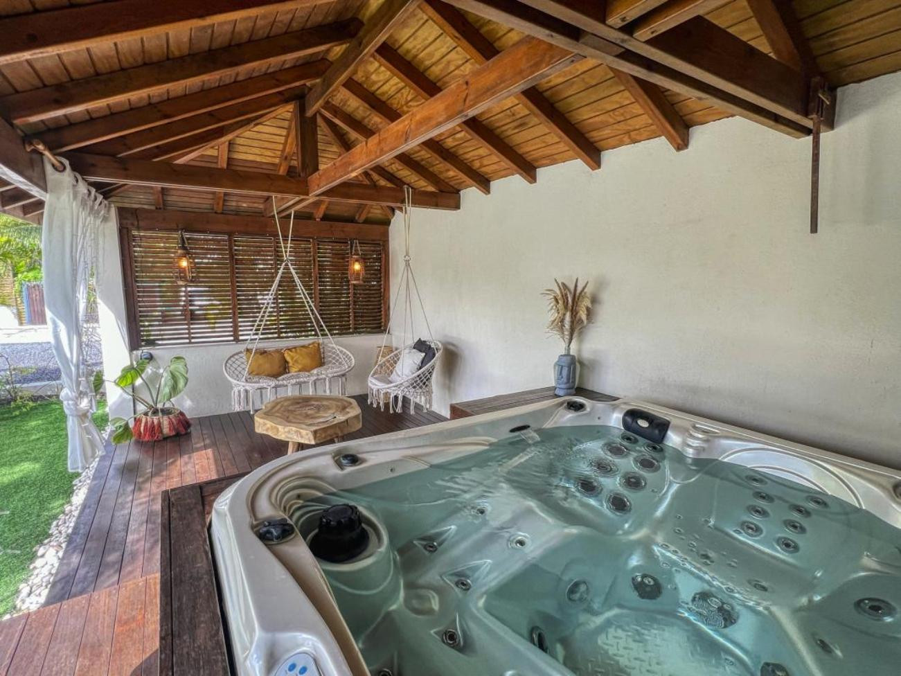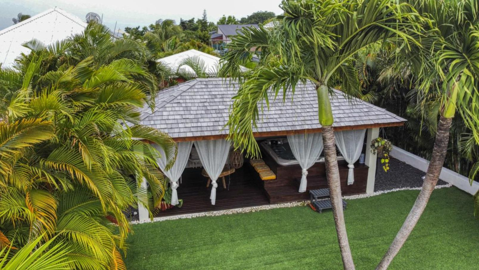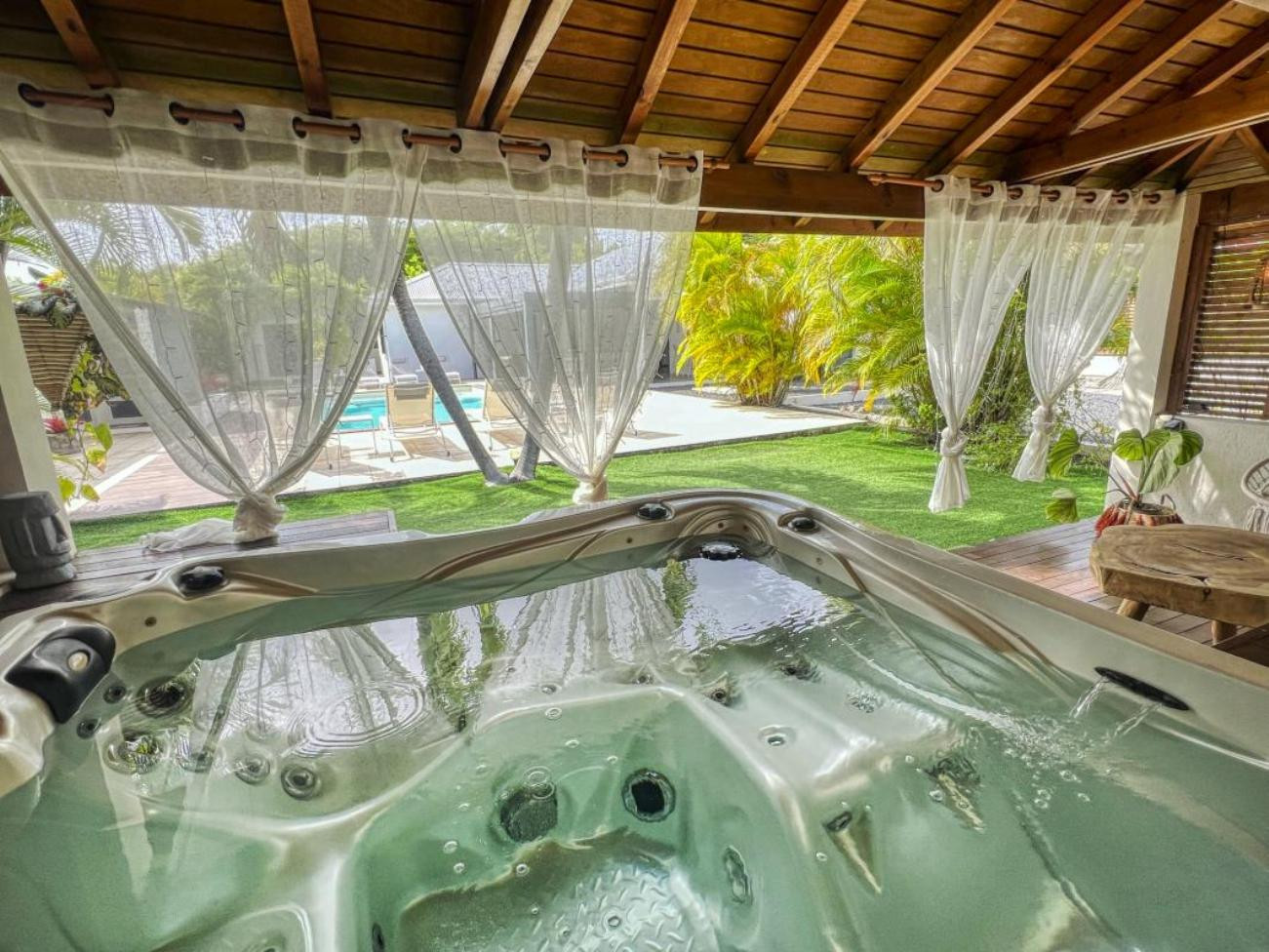 Garden/terrace: terrace of approximately 45 m² with a complete outdoor lounge for meals or relaxation. A relaxation pavilion with a family hot tub is located at the end of the pool. Night lighting will allow you to spend your evenings in a magical setting.