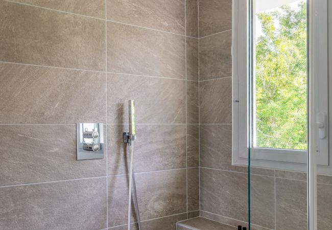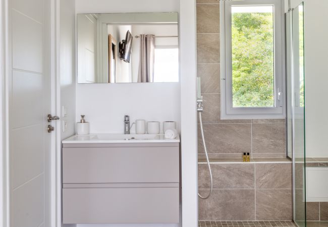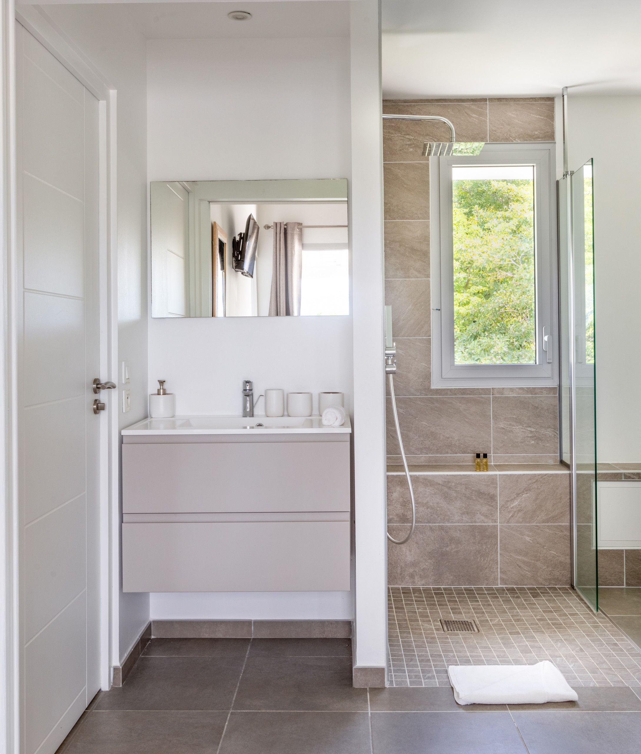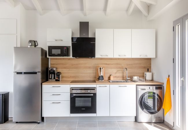 Logement de 43 m² meublé avec goût et moderne, avec vue sur le jardin et la piscine.