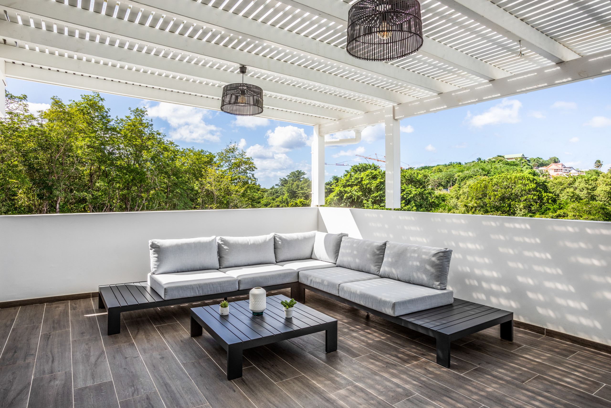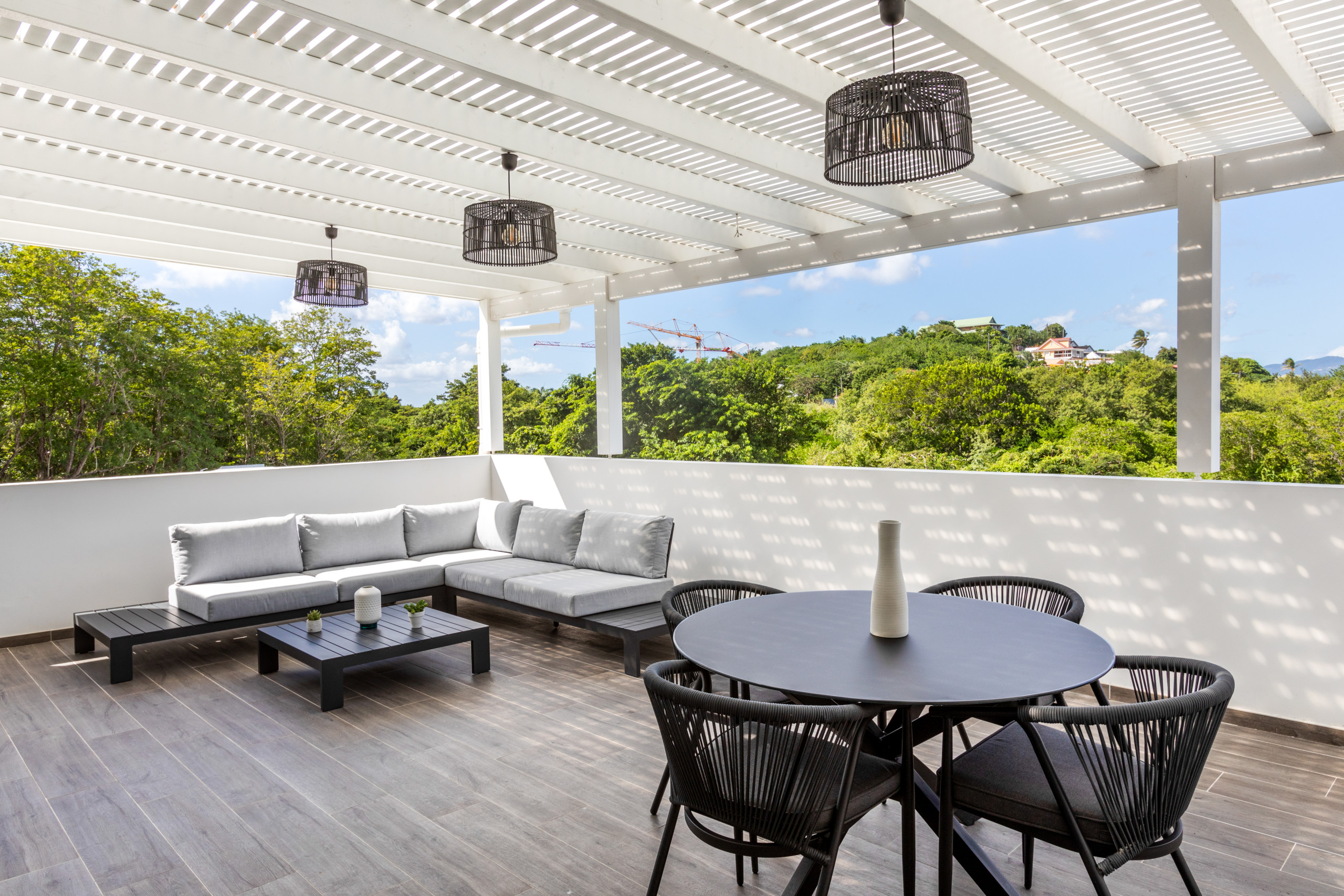 La grande terrasse couverte, véritable atout de l’appartement, offre une vue panoramique sur les environs et accueille un agréable salon extérieur ainsi qu’un espace salle à manger pour savourer vos repas face à l’horizon.