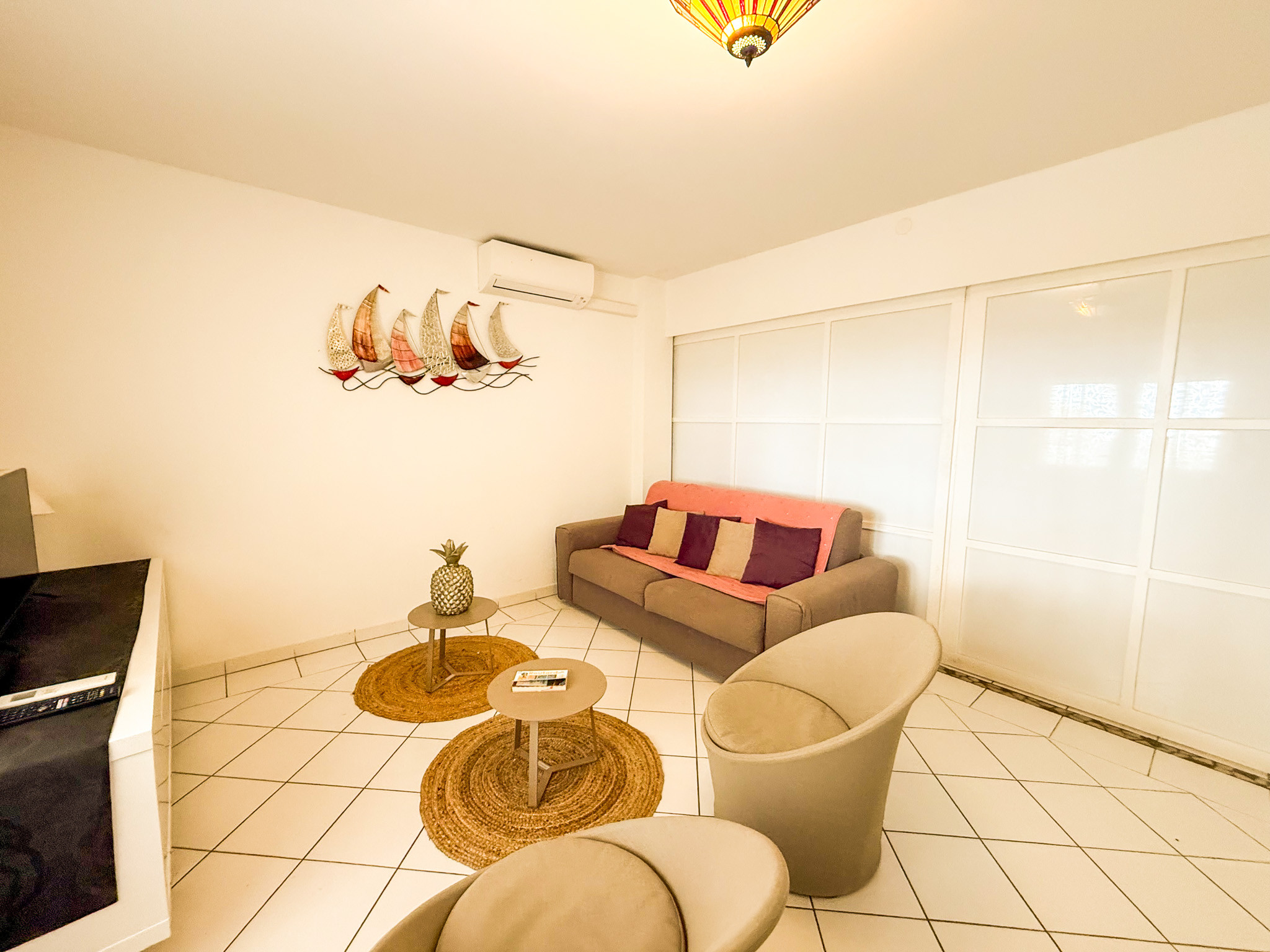 Deux chambres et un salon climatisés joliment meublés, une salle de bain avec WC dans chaque chambre, une salle d'eau, un WC séparé. Magnifique grande cuisine entièrement équipée, entièrement vitrée d'un côté et ouverte sur la terrasse. Le tout en état neuf.