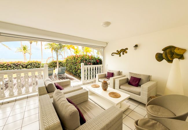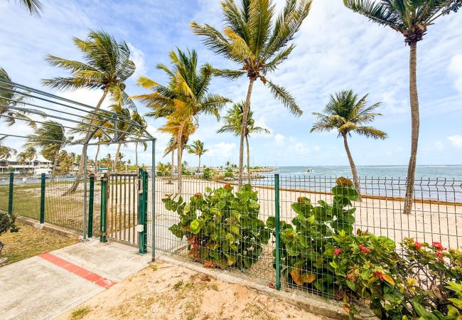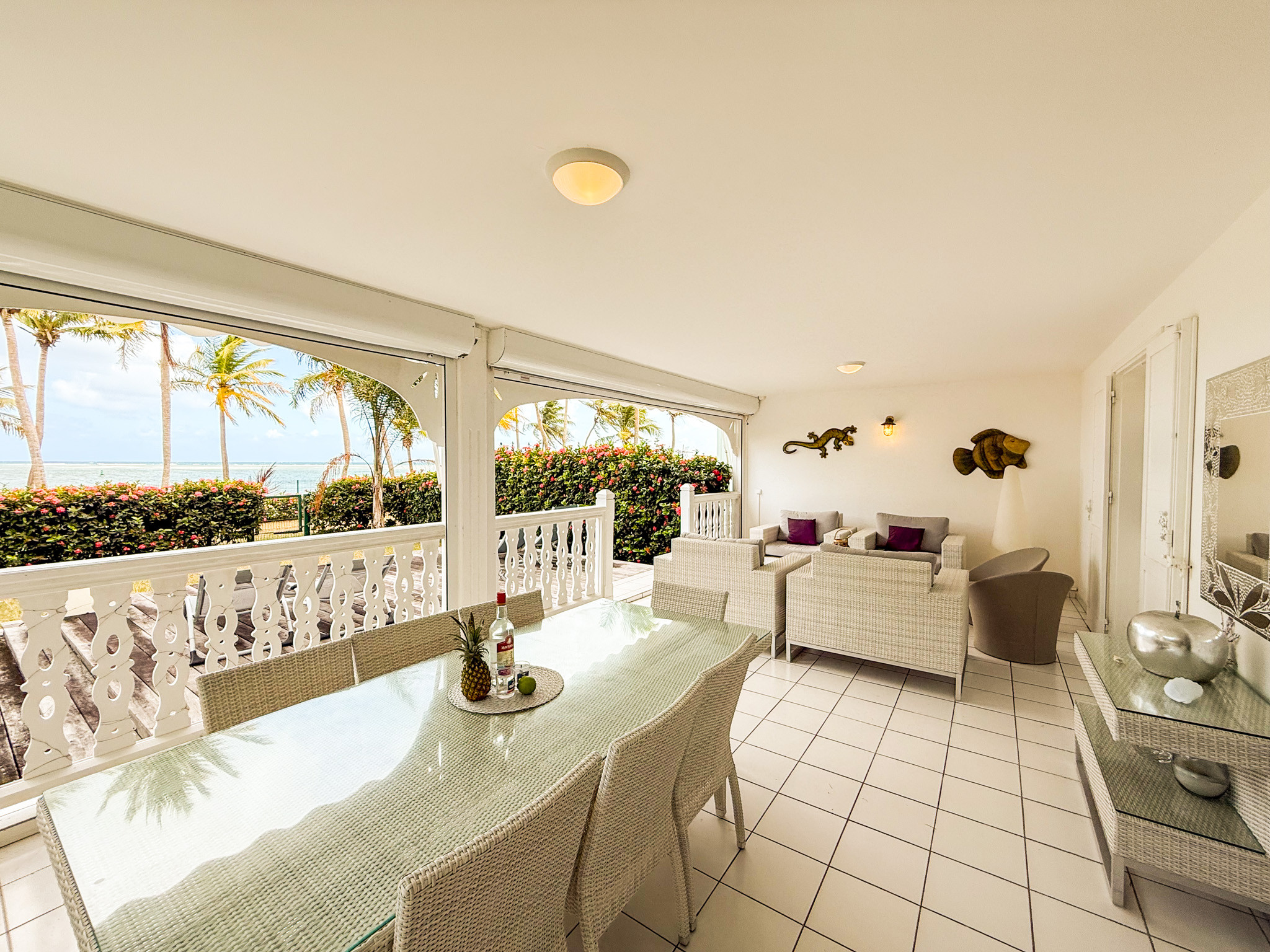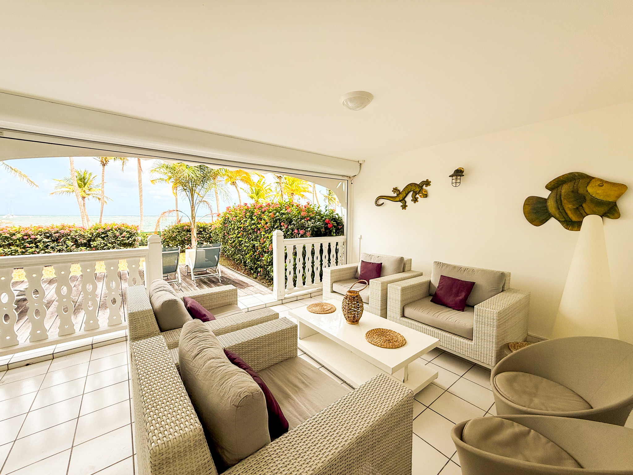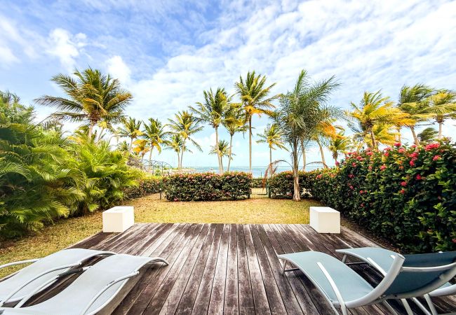 Superbe appartement 'Comme une maison' en rez de jardin, dans une luxueuse résidence close, avec accès direct à la plage de sable blanc au bout du jardin privatif. La vue sur le lagon turquoise est paradisiaque.