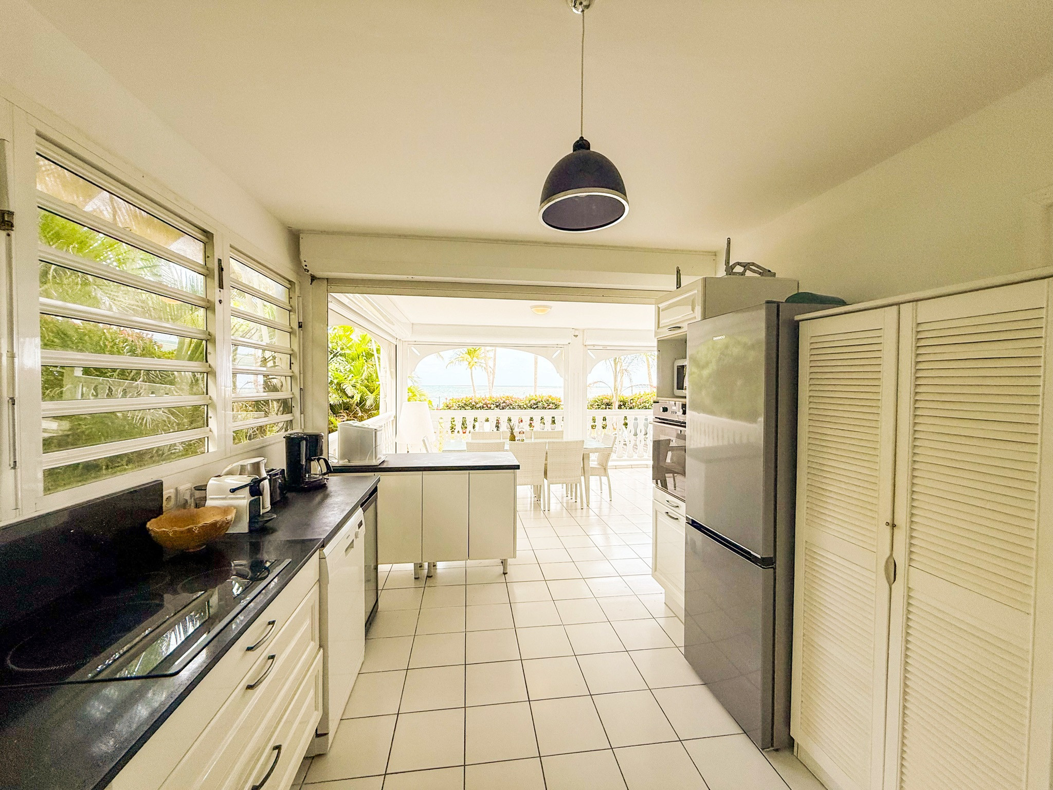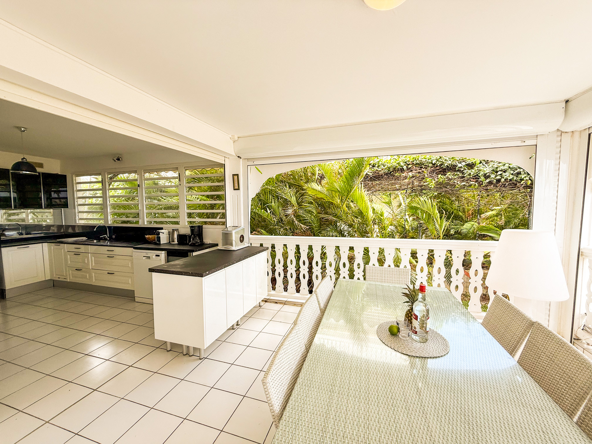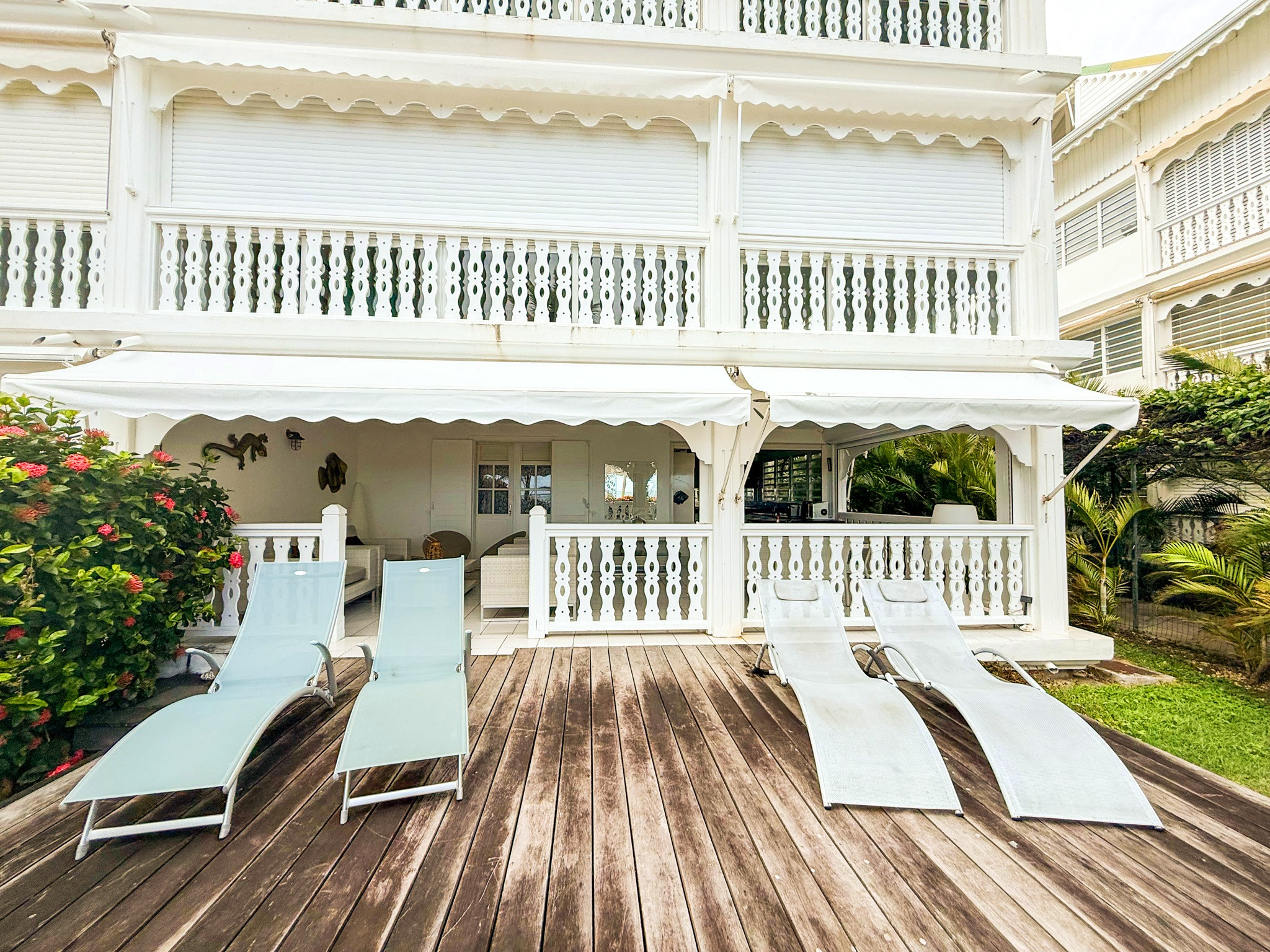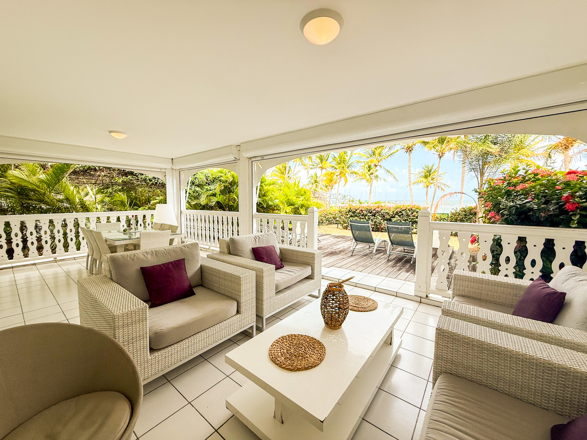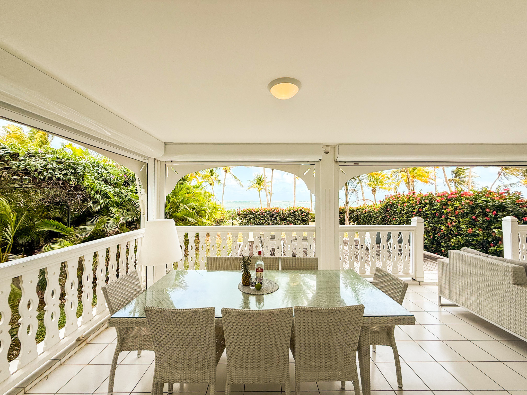 La très grande terrasse couverte donnant sur la mer est aussi un salon confortable et une salle à manger spacieuse. Elle se ferme par des volets roulants.