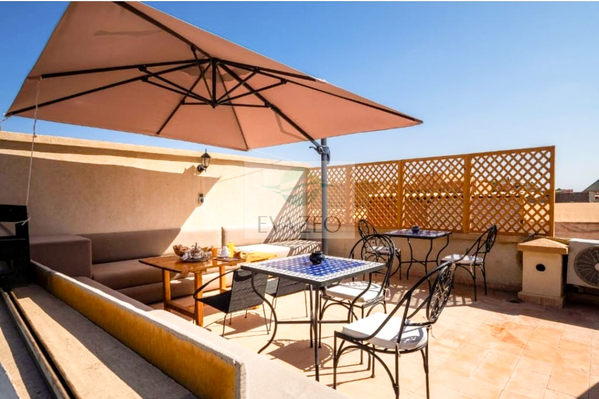 Découvrez l'authenticité marocaine dans cette chambre familiale pour 4 personnes au Riad Sidi Radoine. Niché dans une ruelle paisible à 4 min à pied de Jemaa el-Fna, ce riad intimiste (4 chambres seulement) offre climatisation, salle de bain privative, Wi-Fi gratuit et petit-déjeuner traditionnel servi dans le patio. Profitez du rooftop panoramique au coucher du soleil. Note clients : 8.8/10. -