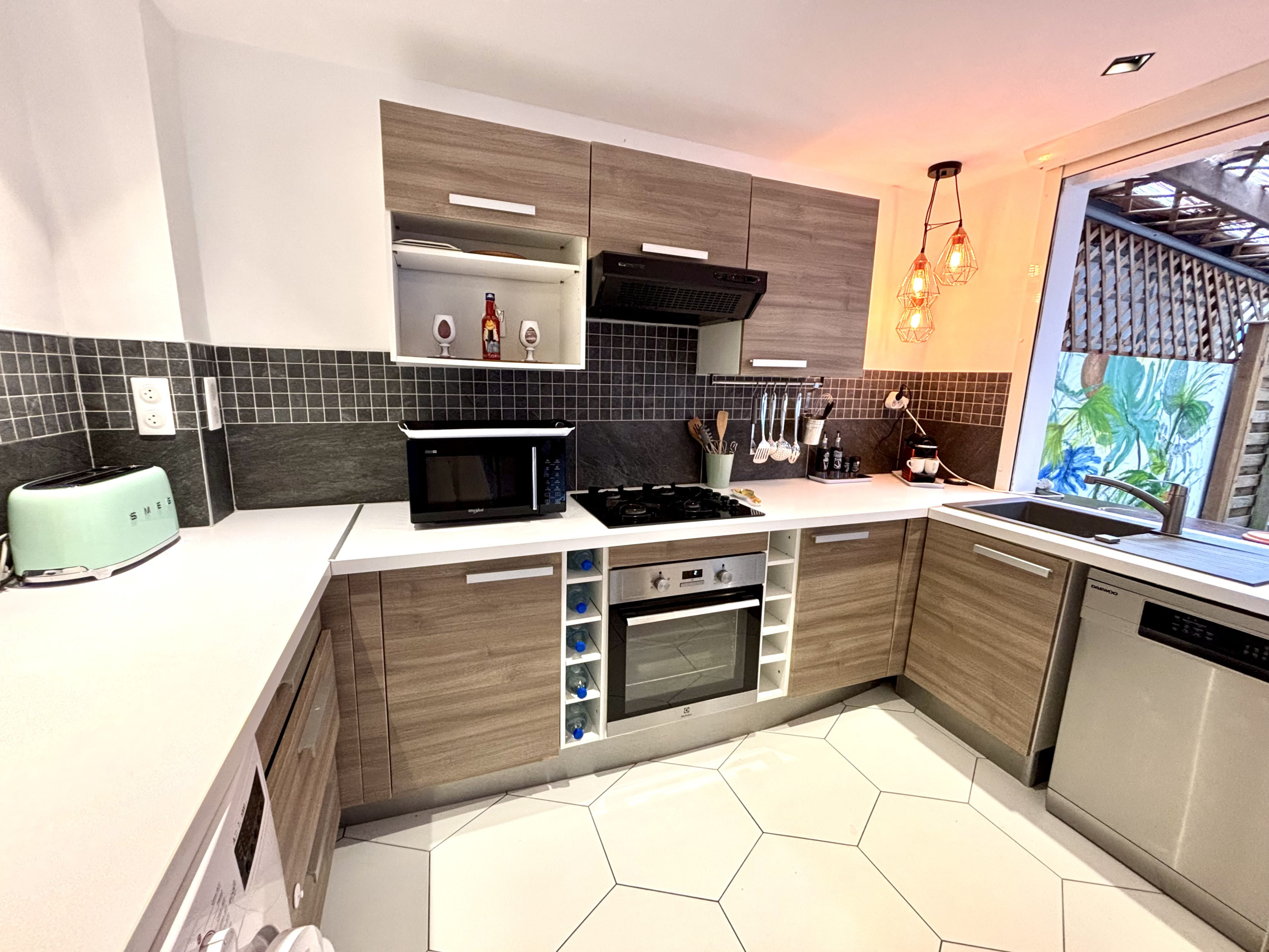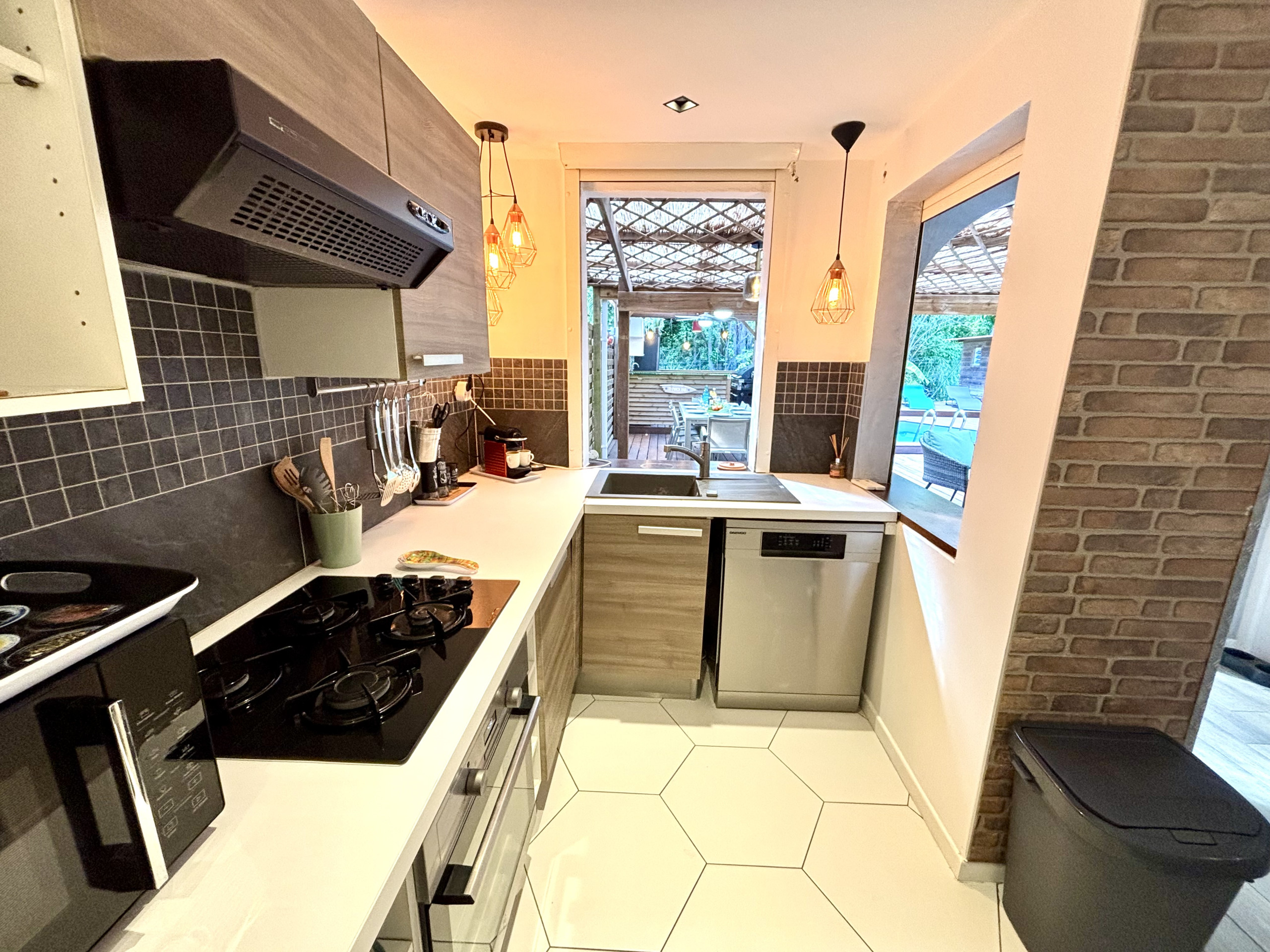Equipements de la cuisine : cuisinière avec plaques de cuisson, four, four à micro-ondes, réfrigérateur-congélateur, cafetière Nespresso et cafetière à filtres, grille pain, lave vaisselle, bouilloire, divers ustensiles et jeu complet de vaisselle.