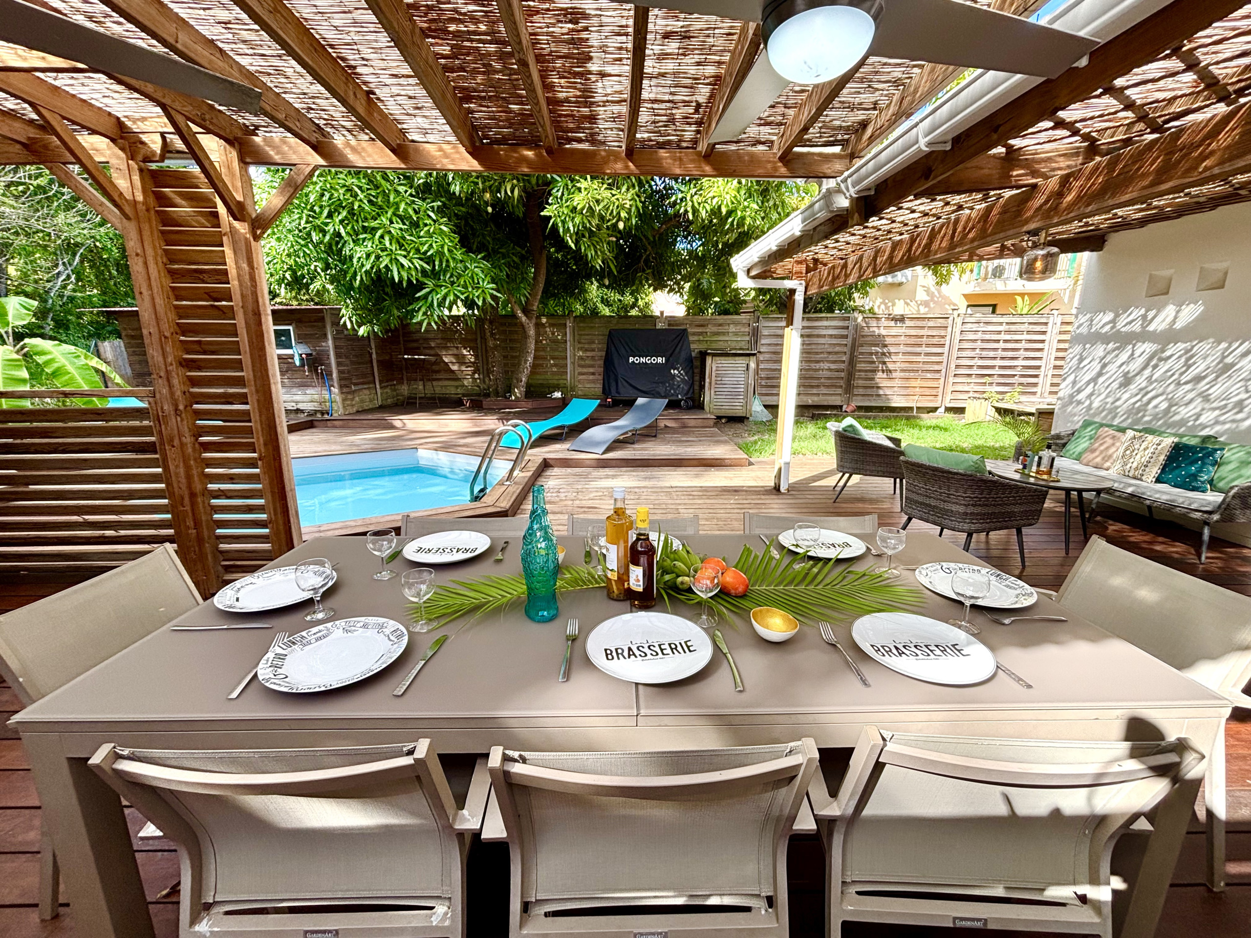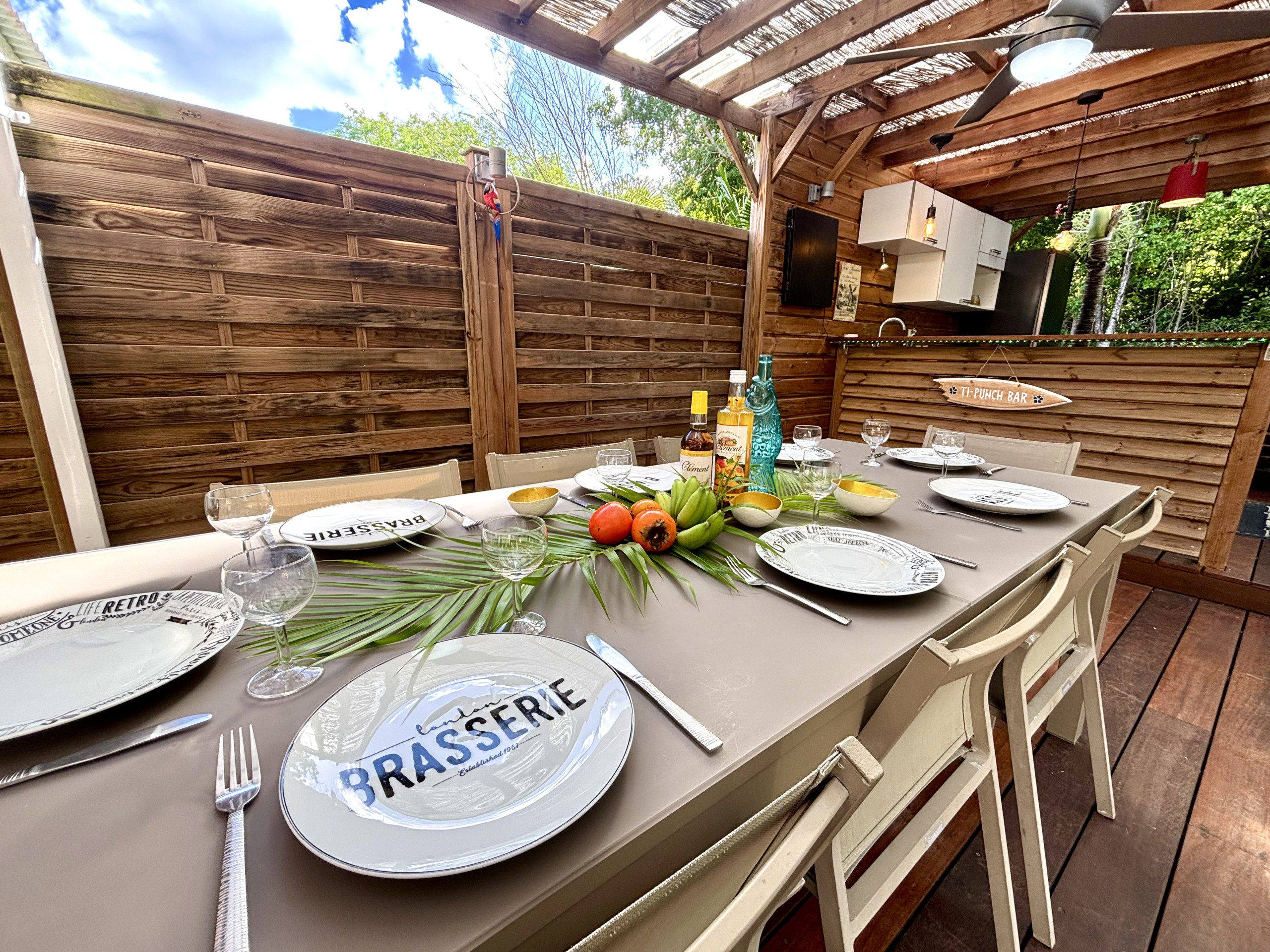 Jardin/terrasse : terrasse couverte avec mobilier d'extérieur complet pour les repas et la détente. La maison est située dans un grand jardin de 2500m².
