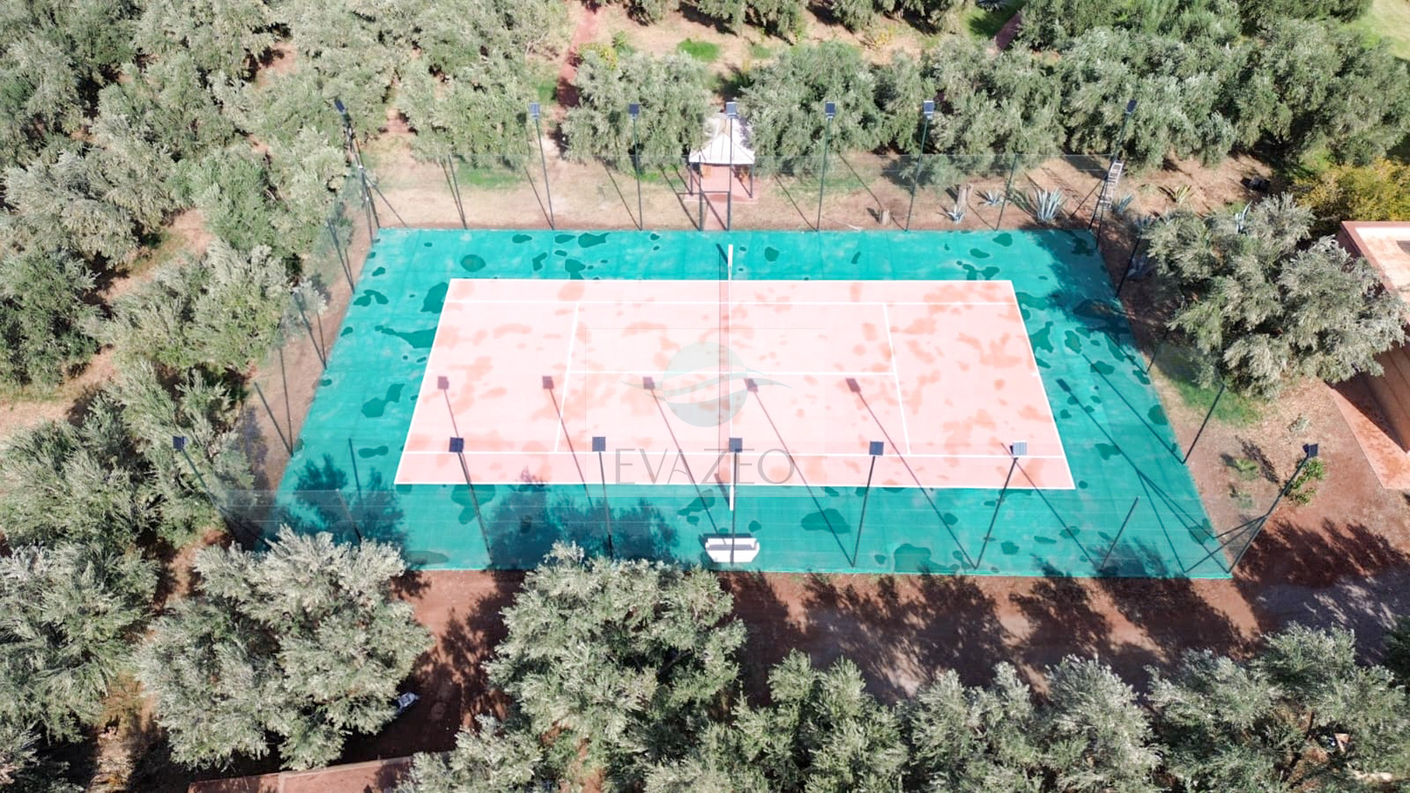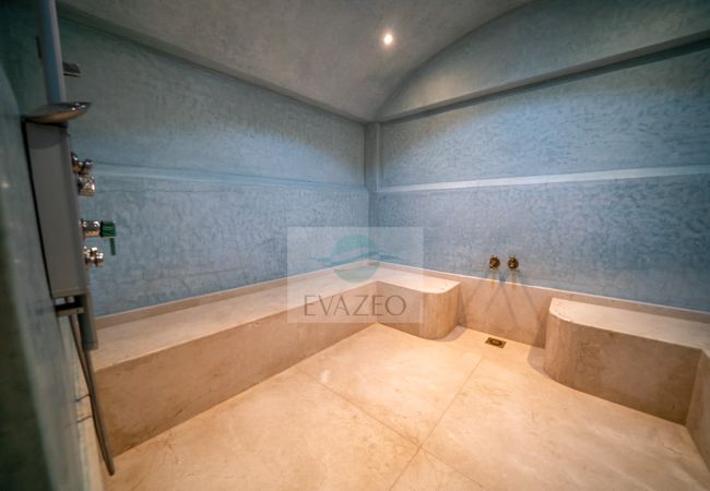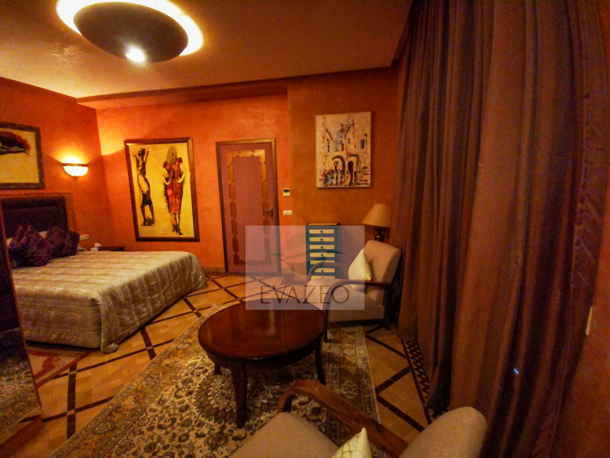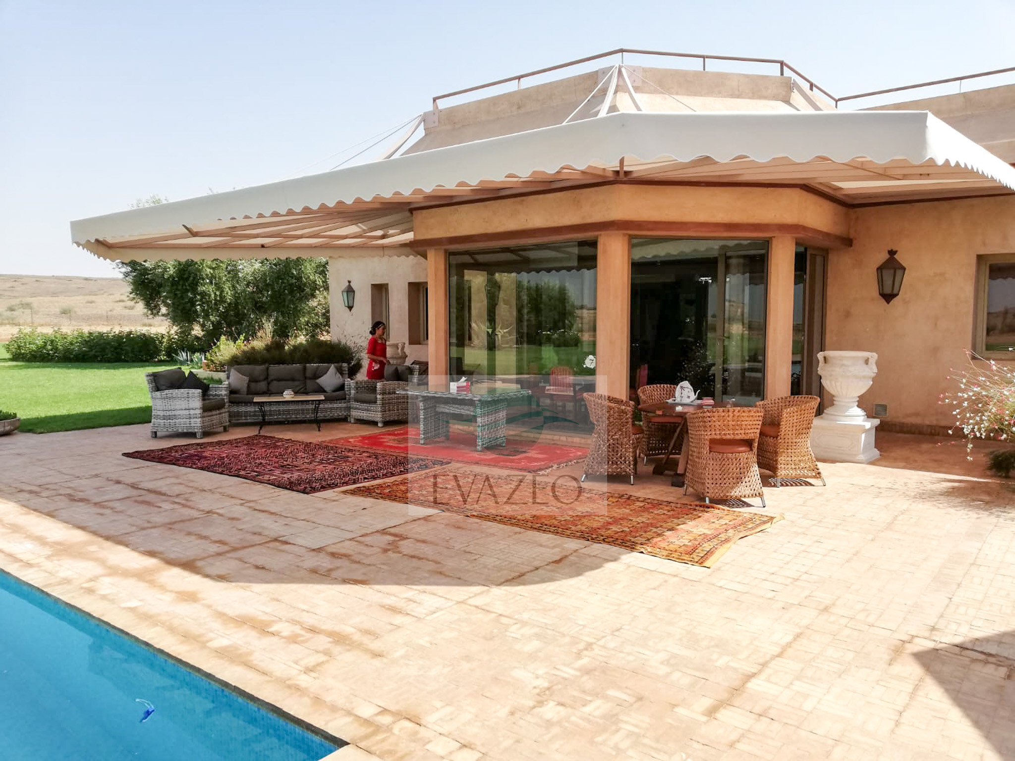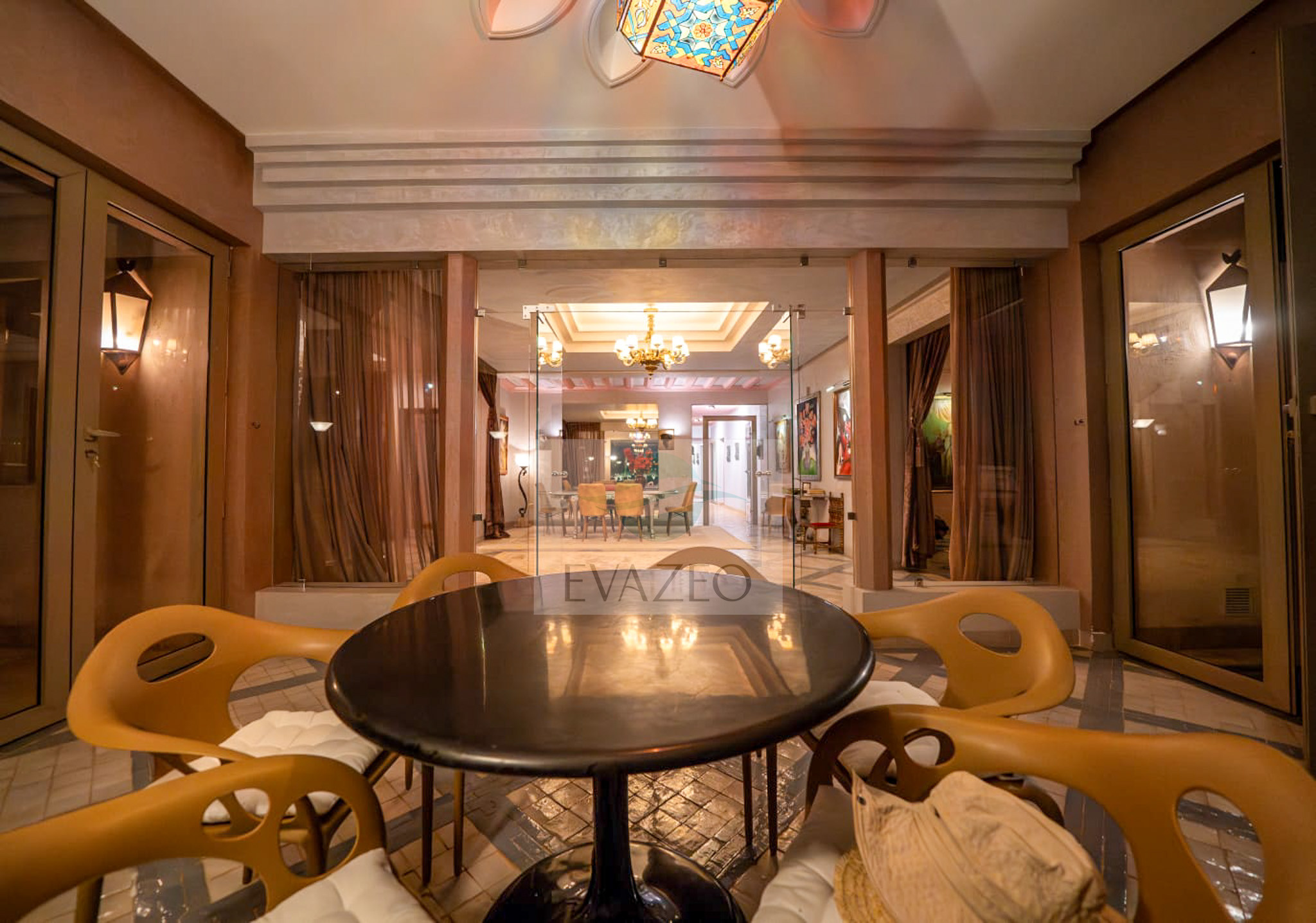 Détendez-vous dans des espaces de vie chaleureux : salon marocain traditionnel avec cheminée et grand écran TV, salon européen, salon d'hiver vitré avec vue panoramique sur le domaine, salle à manger et cuisine entièrement équipée. Un écrin de tranquillité gardienné 24h/24, sans aucun voisinage.
