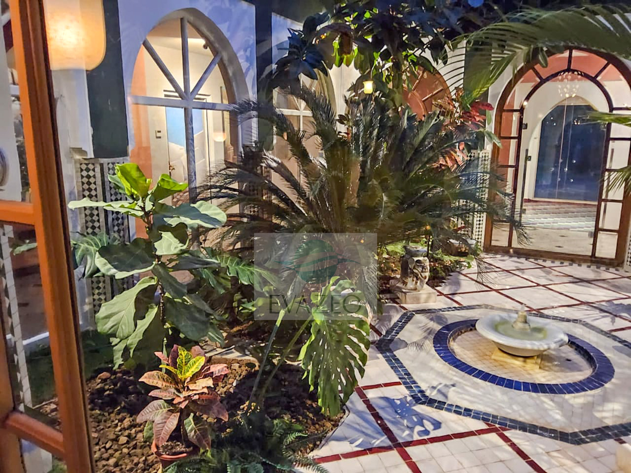 La villa principale déploie ses espaces de réception au rez-de-chaussée : un hall d'entrée majestueux avec patio vitré végétalisé, un immense salon, une salle à manger d'hiver panoramique, un salon TV avec cheminée et un espace bar. Deux suites avec salle de douche privative et terrasse couverte complètent ce niveau climatisé. La cuisine professionnelle entièrement équipée dispose d'un accès jardin et d'un espace dédié au personnel. Un escalier mène à une salle de billard en sous-sol.