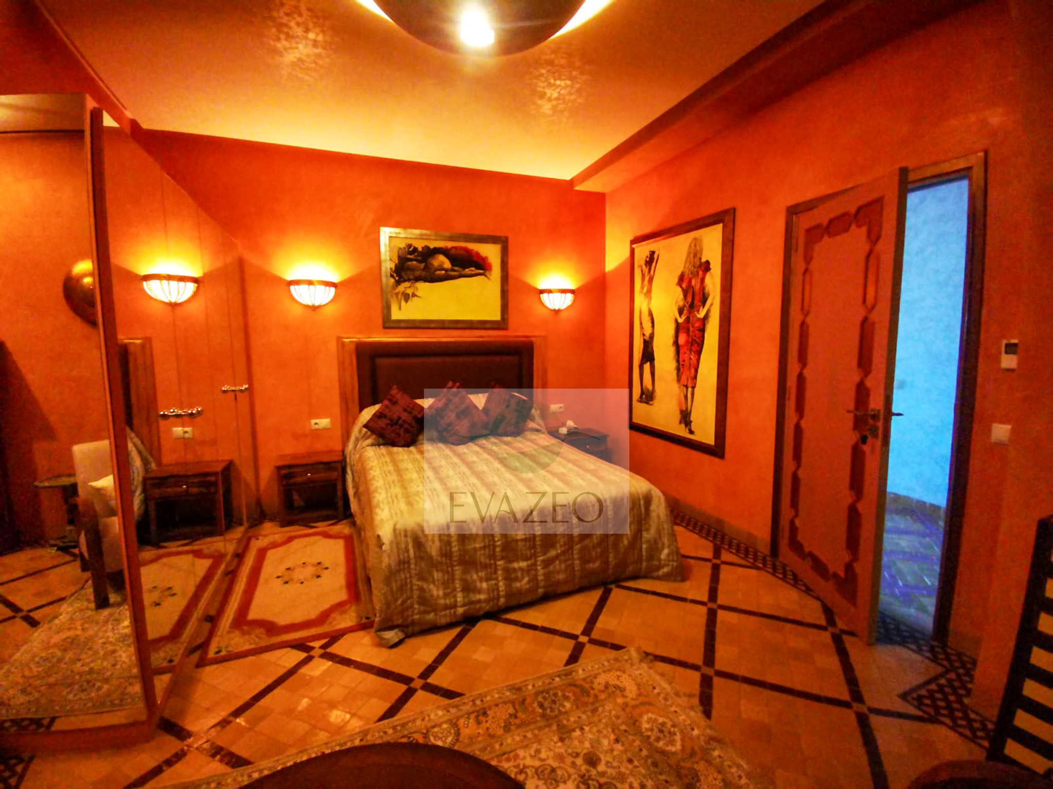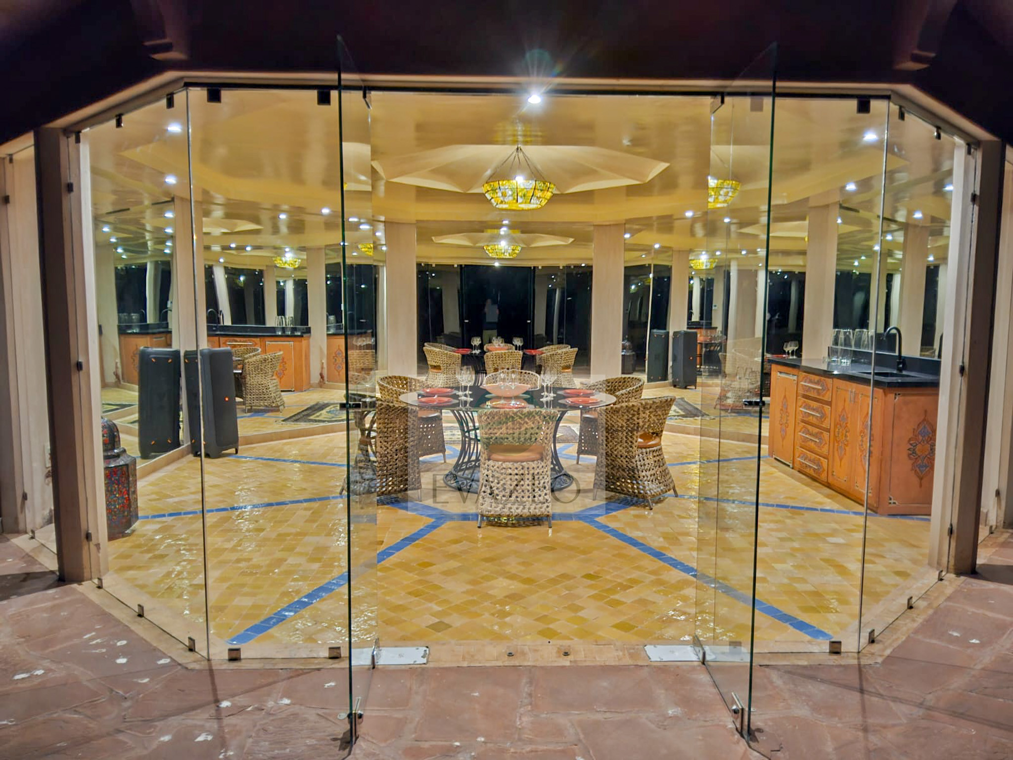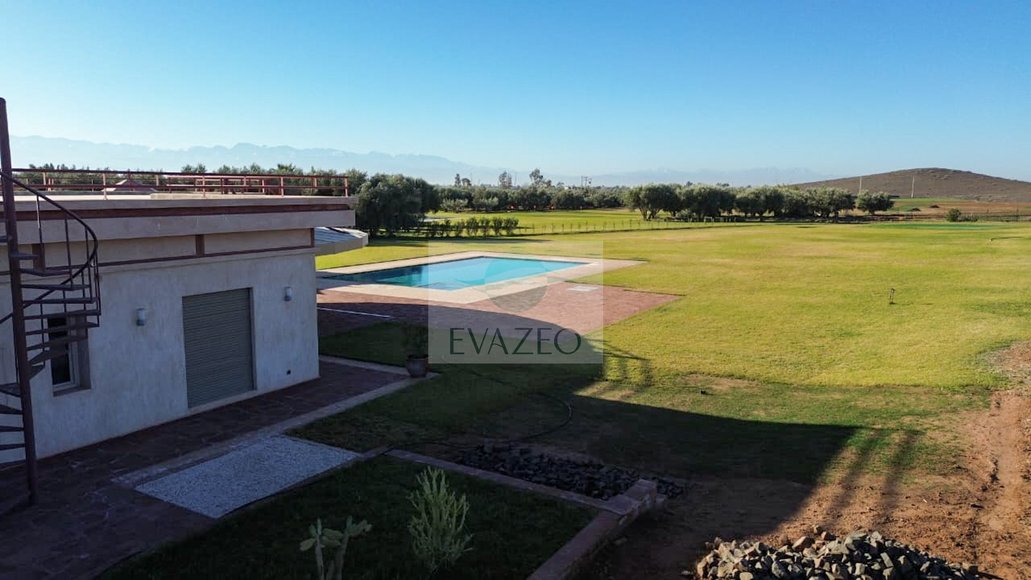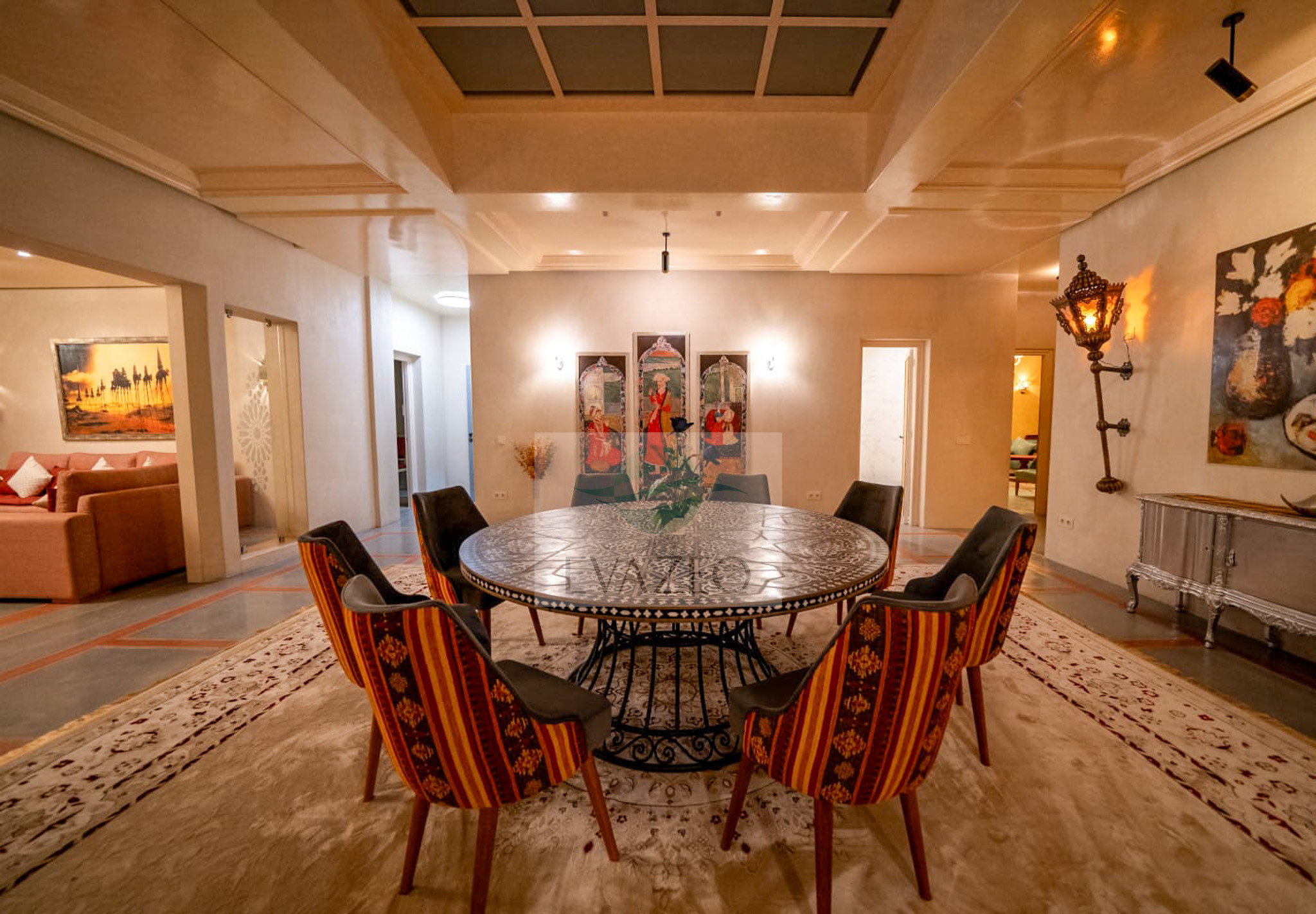 Profitez d'espaces de vie généreux : salon marocain traditionnel avec cheminée et grand écran TV, salon européen, salon d'hiver vitré offrant une vue panoramique sur le domaine, salle à manger et cuisine entièrement équipée. Un havre de paix gardienné 24h/24, sans aucun voisinage.