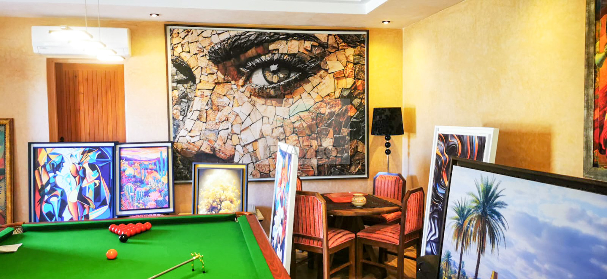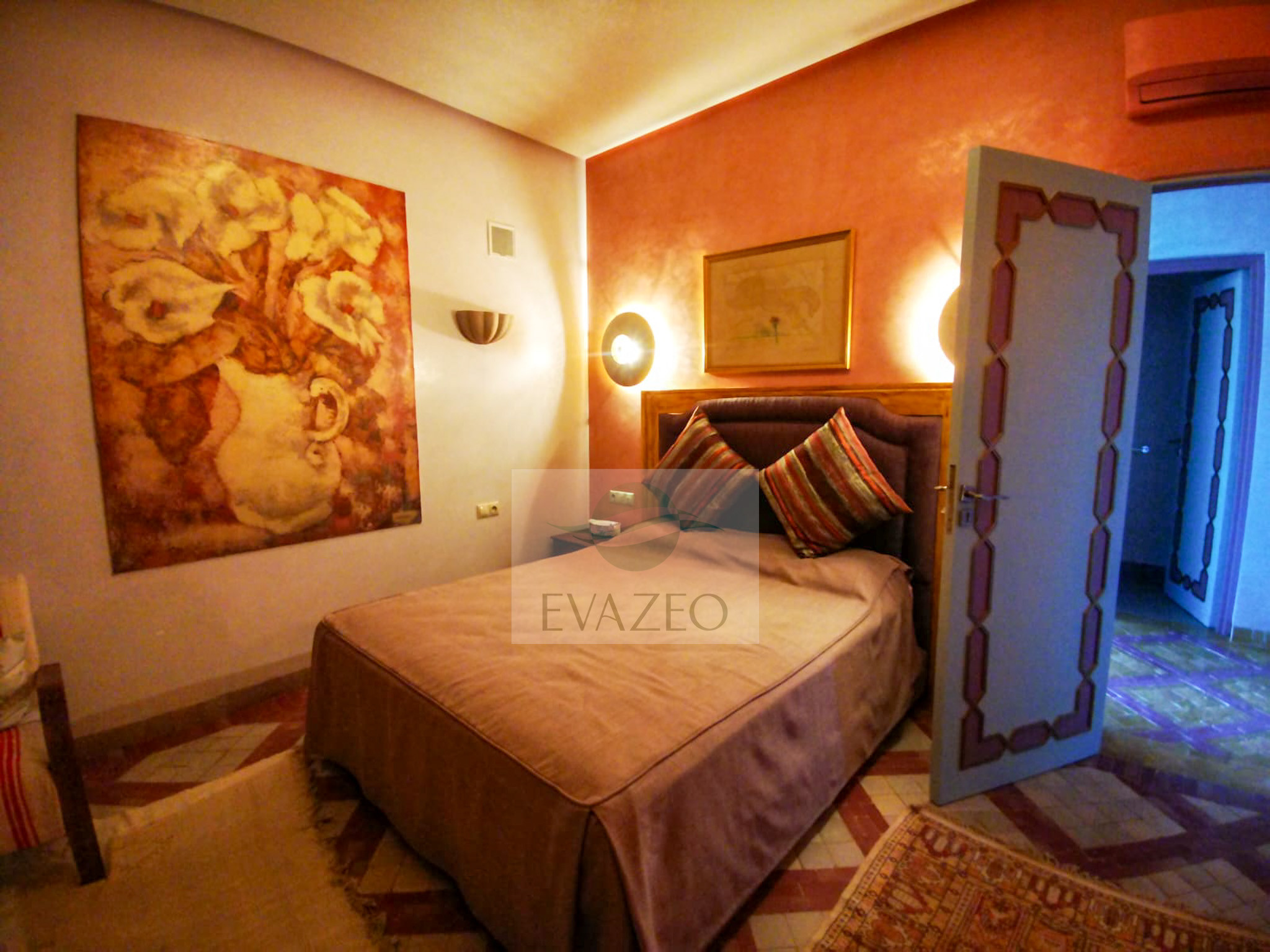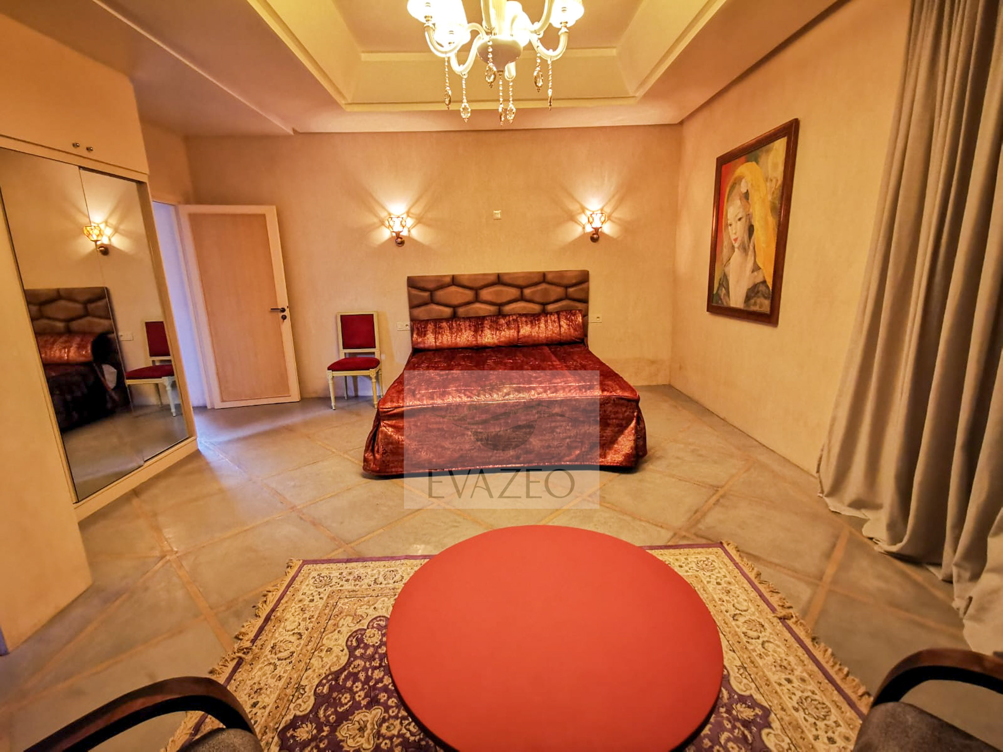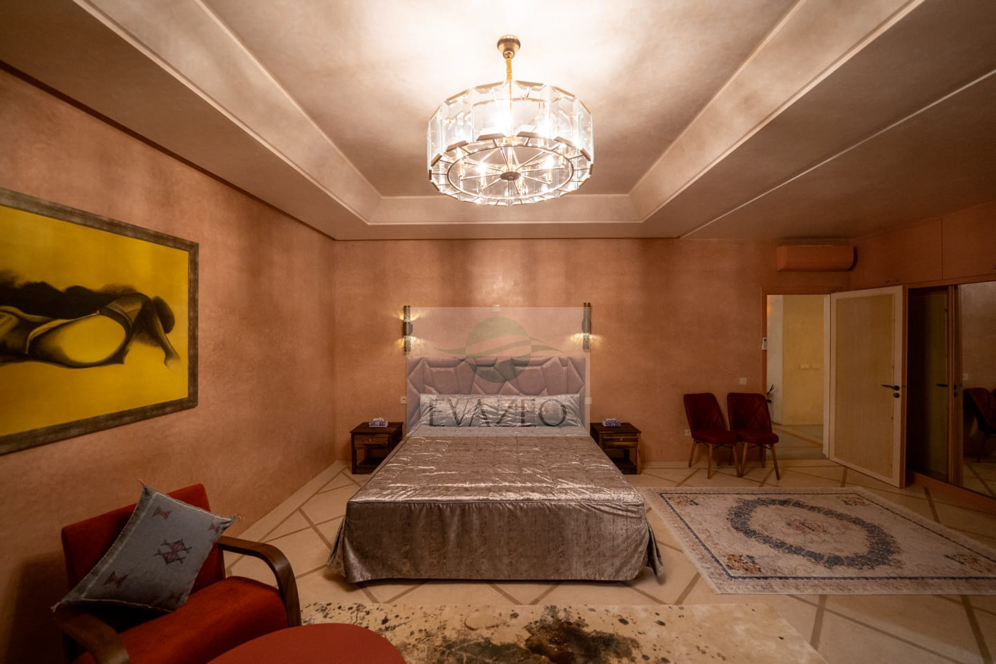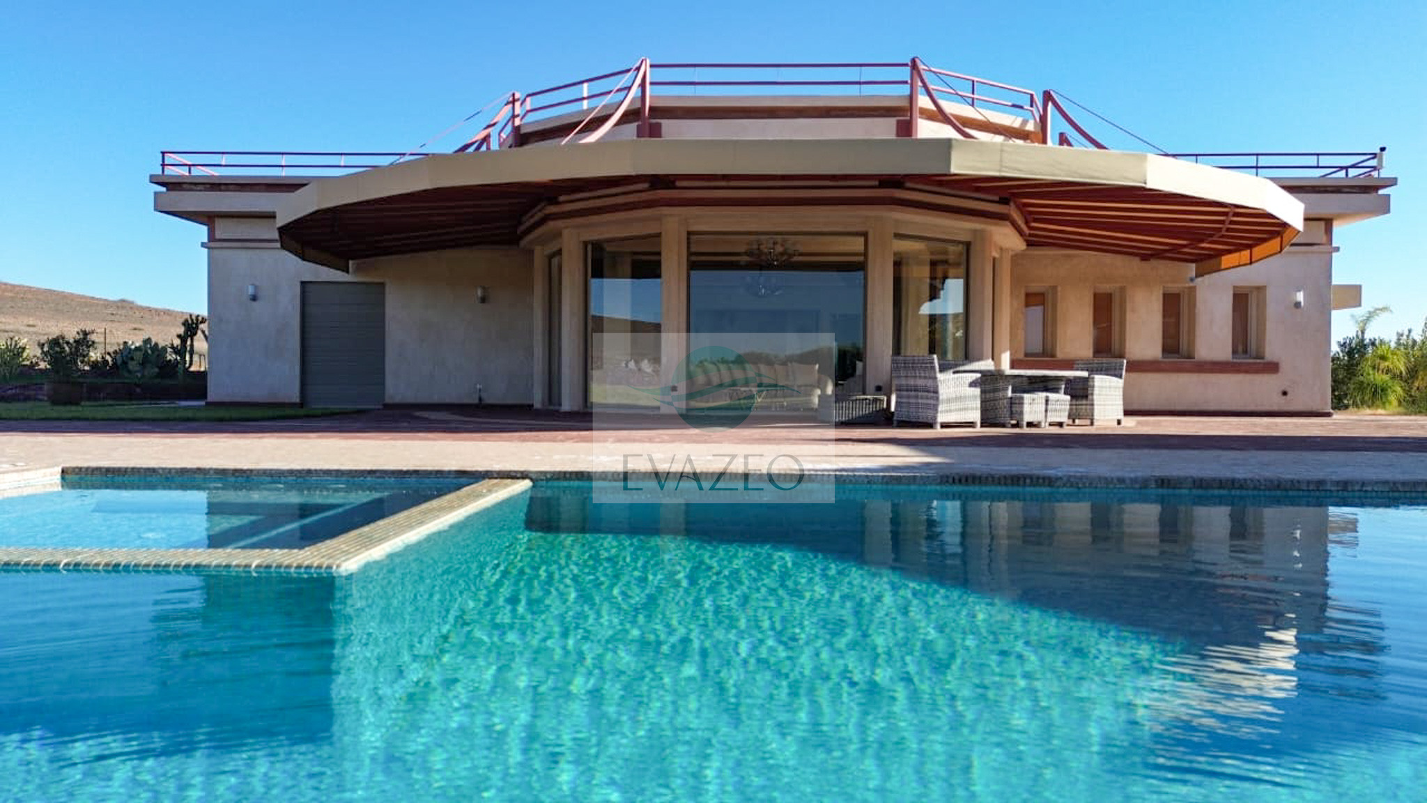Profitez d'espaces de vie généreux : salon marocain traditionnel avec cheminée et grand écran TV, salon européen, salon d'hiver vitré offrant une vue panoramique sur le domaine, salle à manger et cuisine entièrement équipée. Un havre de paix gardienné 24h/24, sans aucun voisinage.
