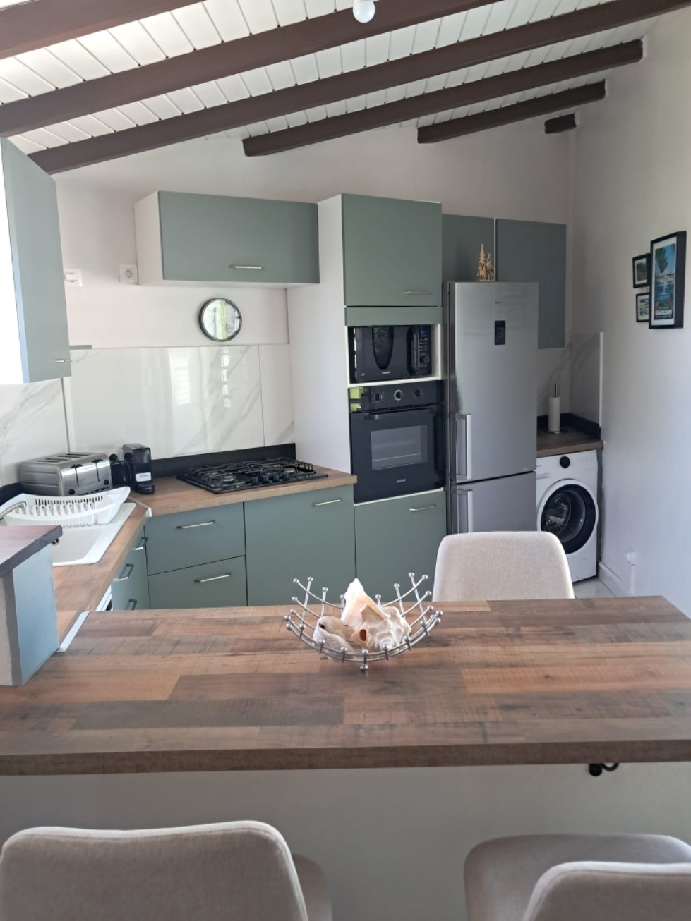 Equipements de la cuisine : plaques de cuisson 4 feux, four, four micro-onde, hotte aspirante, réfrigérateur/congélateur, cafetière à filtres, grille pain, divers ustensiles de cuisine et jeu complet de vaisselle.