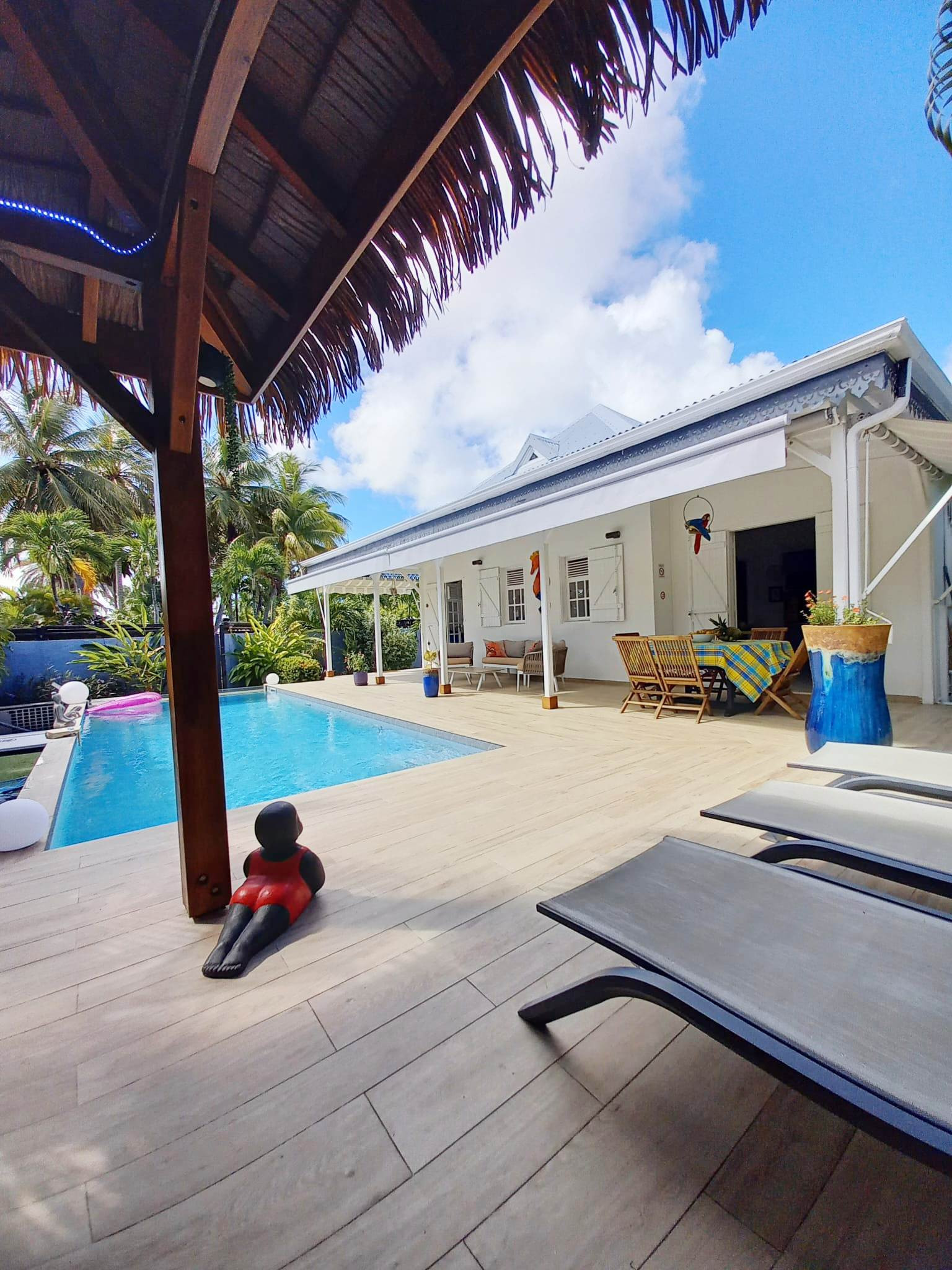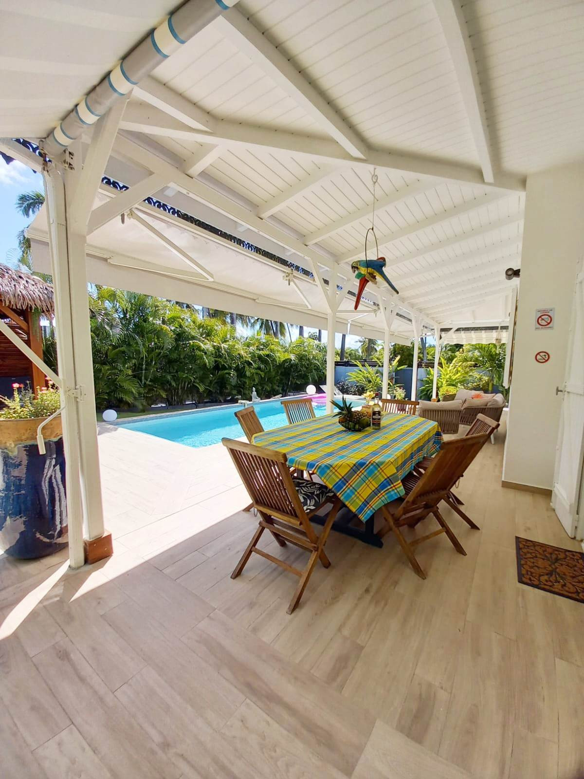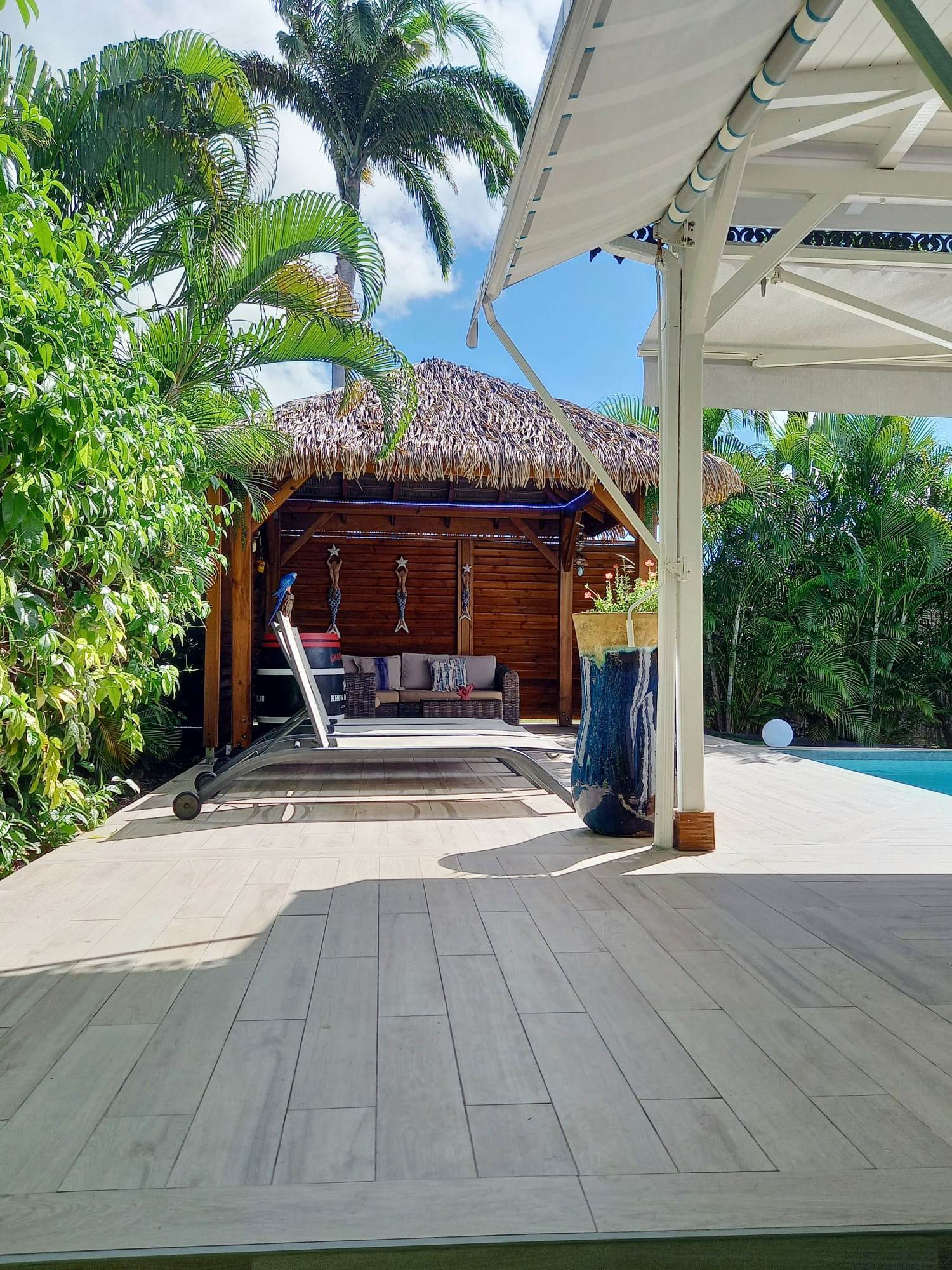 Jardin/terrasse : terrasse couverte avec salons d'extérieur complets pour les repas. Carbet couvert dans le prolongement de la piscine pour la détente.