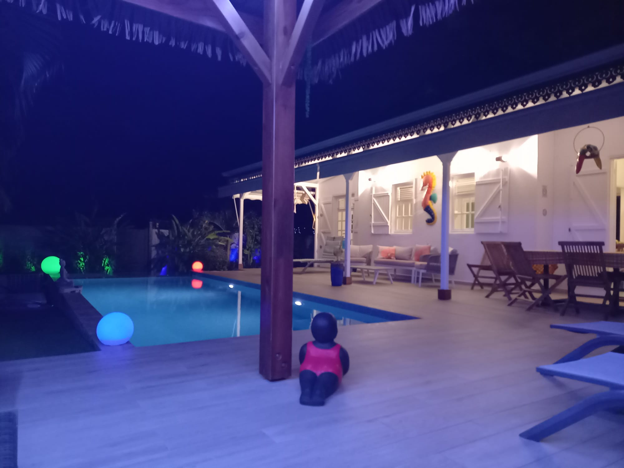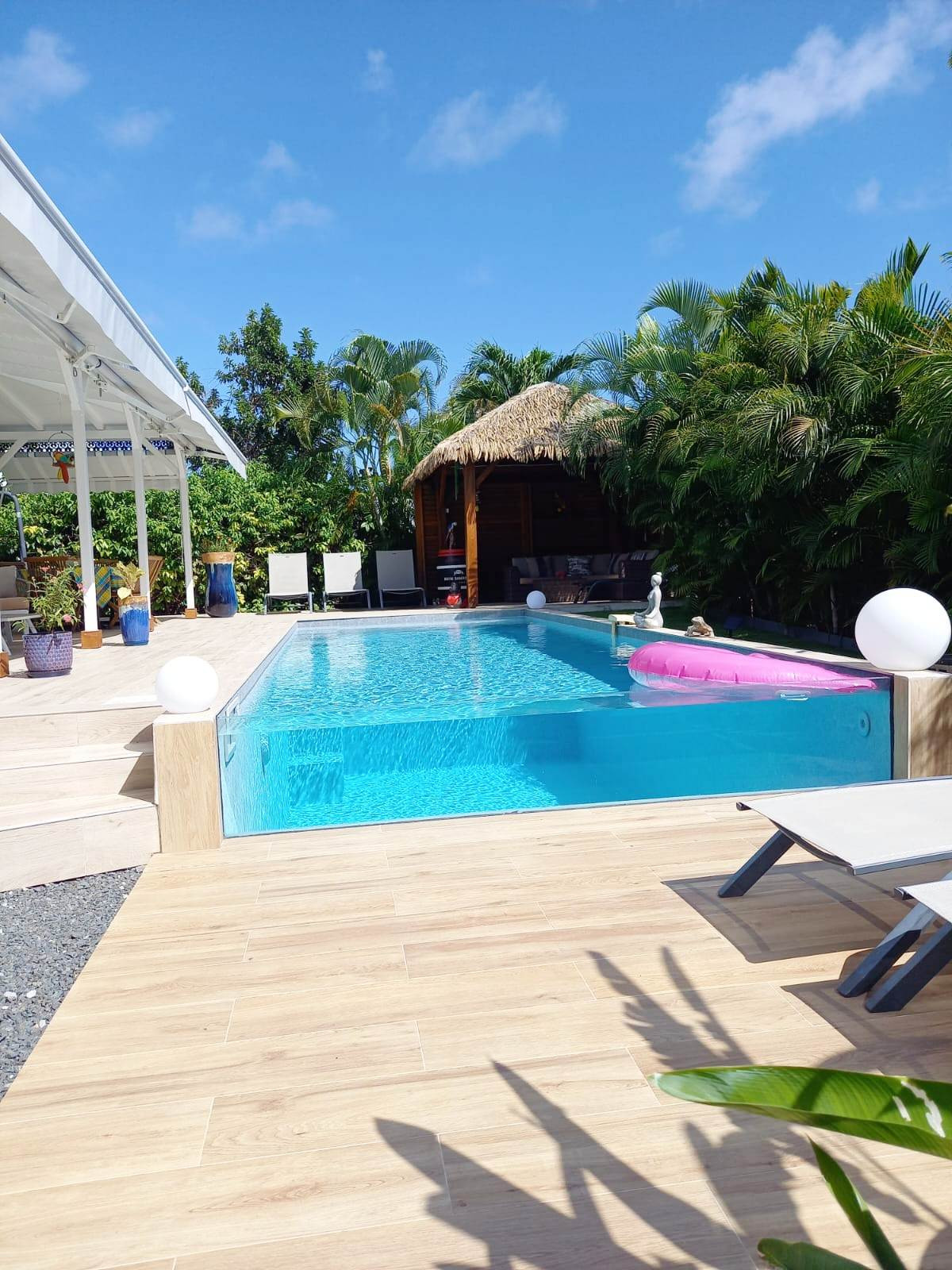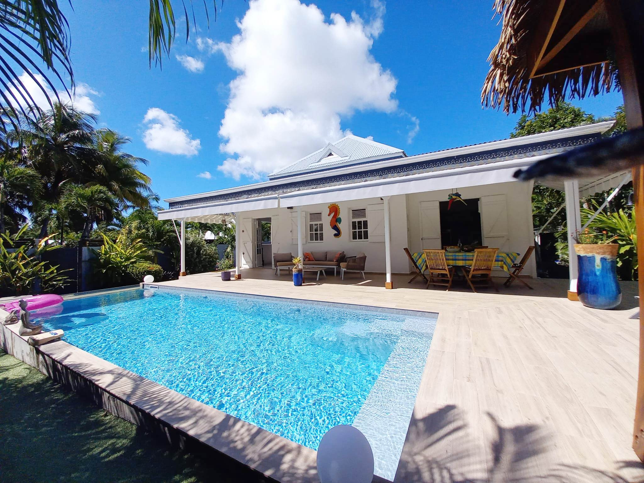 Jardin/terrasse : terrasse couverte avec salons d'extérieur complets pour les repas. Carbet couvert dans le prolongement de la piscine pour la détente.