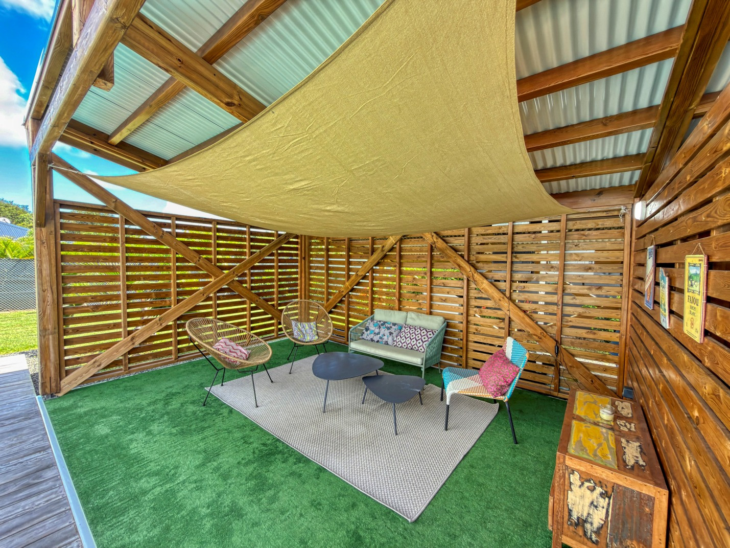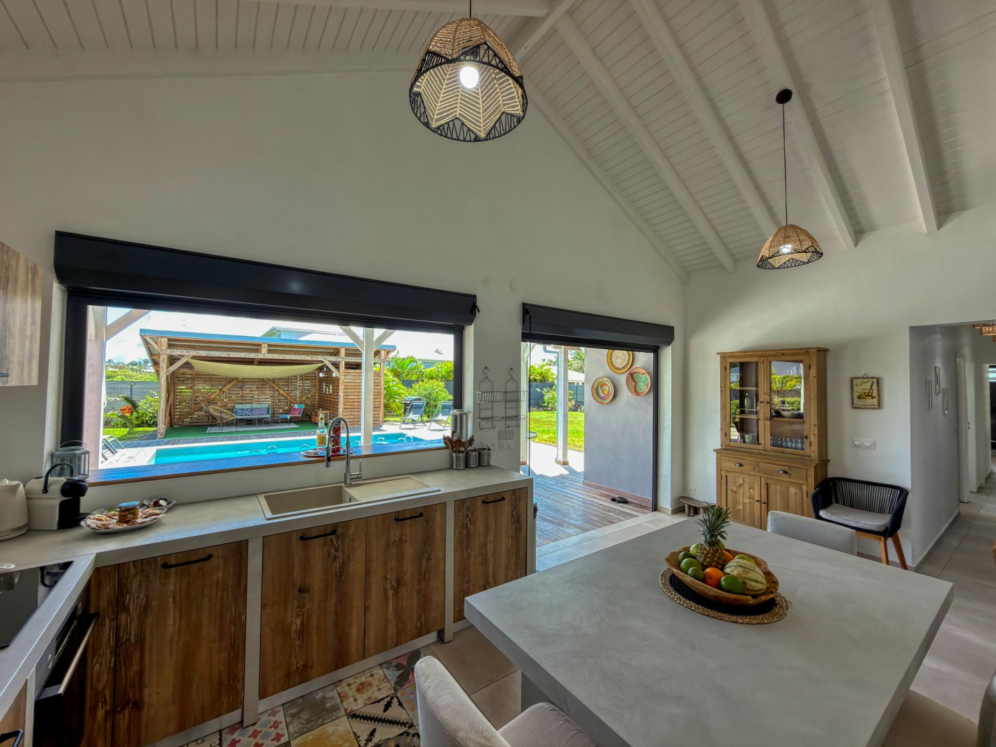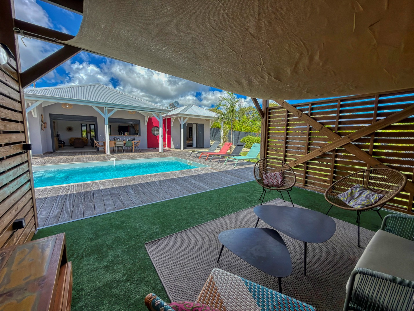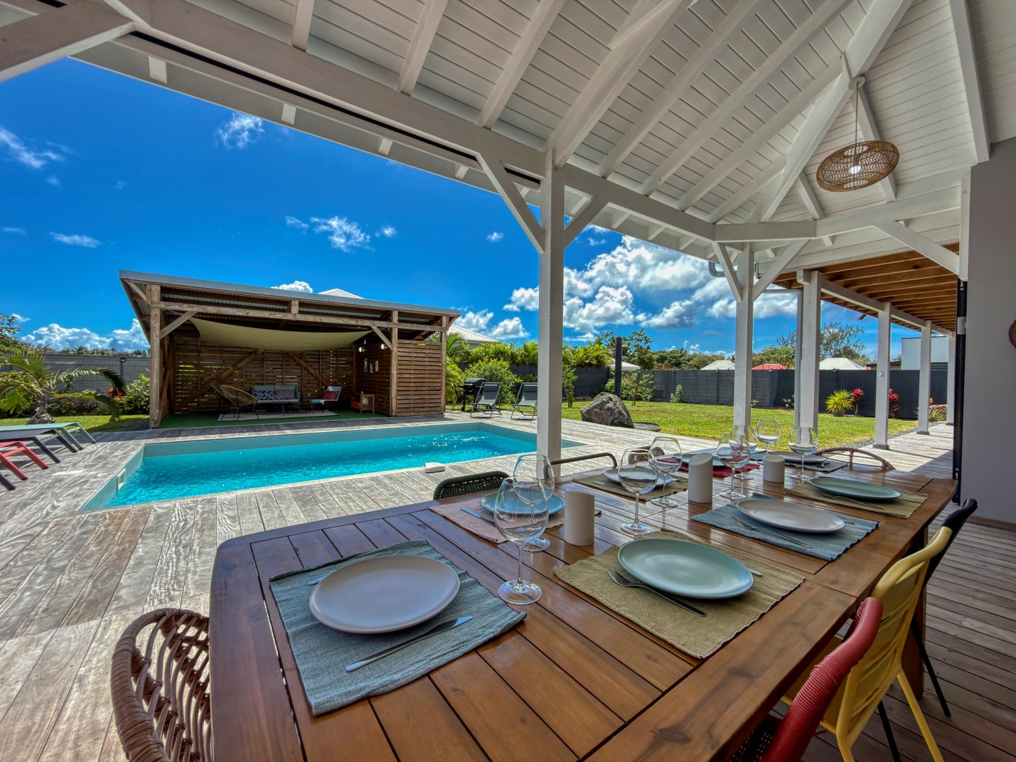 Jardin/terrasse : terrasse couverte avec mobilier d'extérieur complet pour les repas et les moments de détente. Carbet couvert face à la piscine idéal pour l'apéritif.
