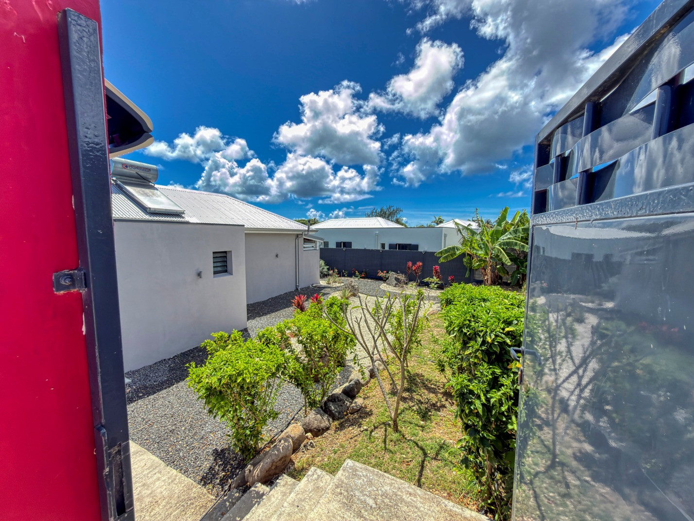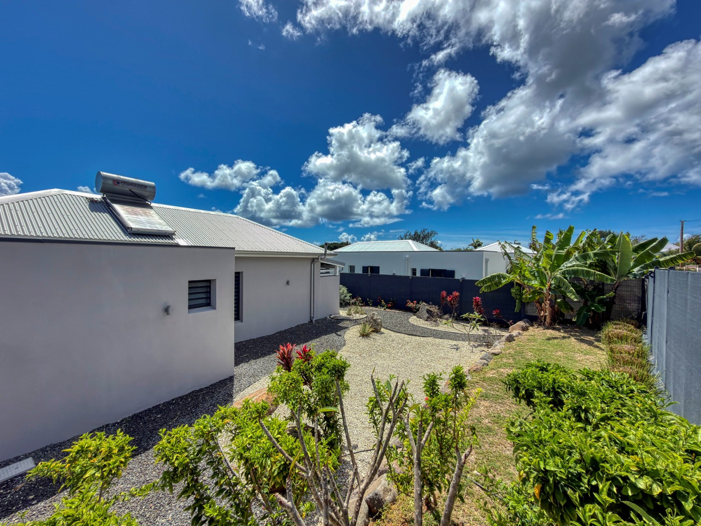 Présence d'une cuve/réserve d'eau : oui (2000 litres pour la villa bleue et 1200 litres pour la villa jaune).