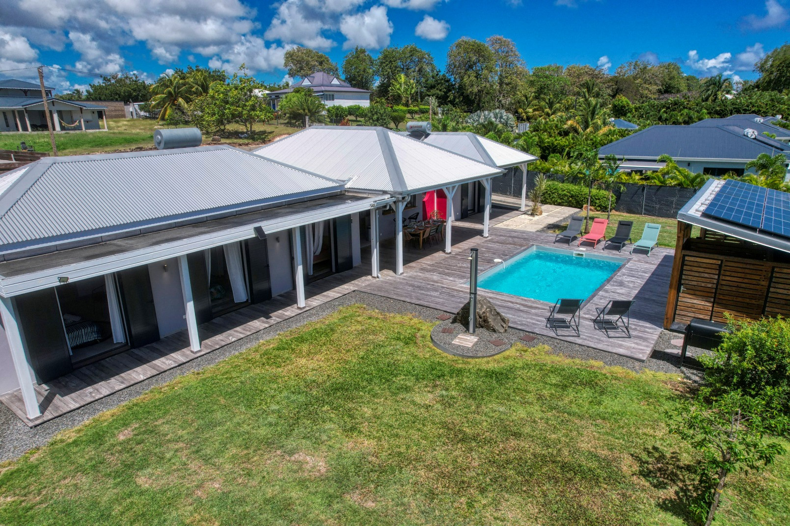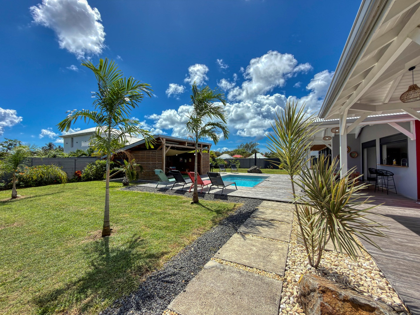 Piscine : oui, jolie piscine d'environ 4mx3m avec une profondeur maximale de 1,6m disposant d'une barrière de sécurité amovible pour les enfants. Transats et carbet d'agrément pour le farniente.