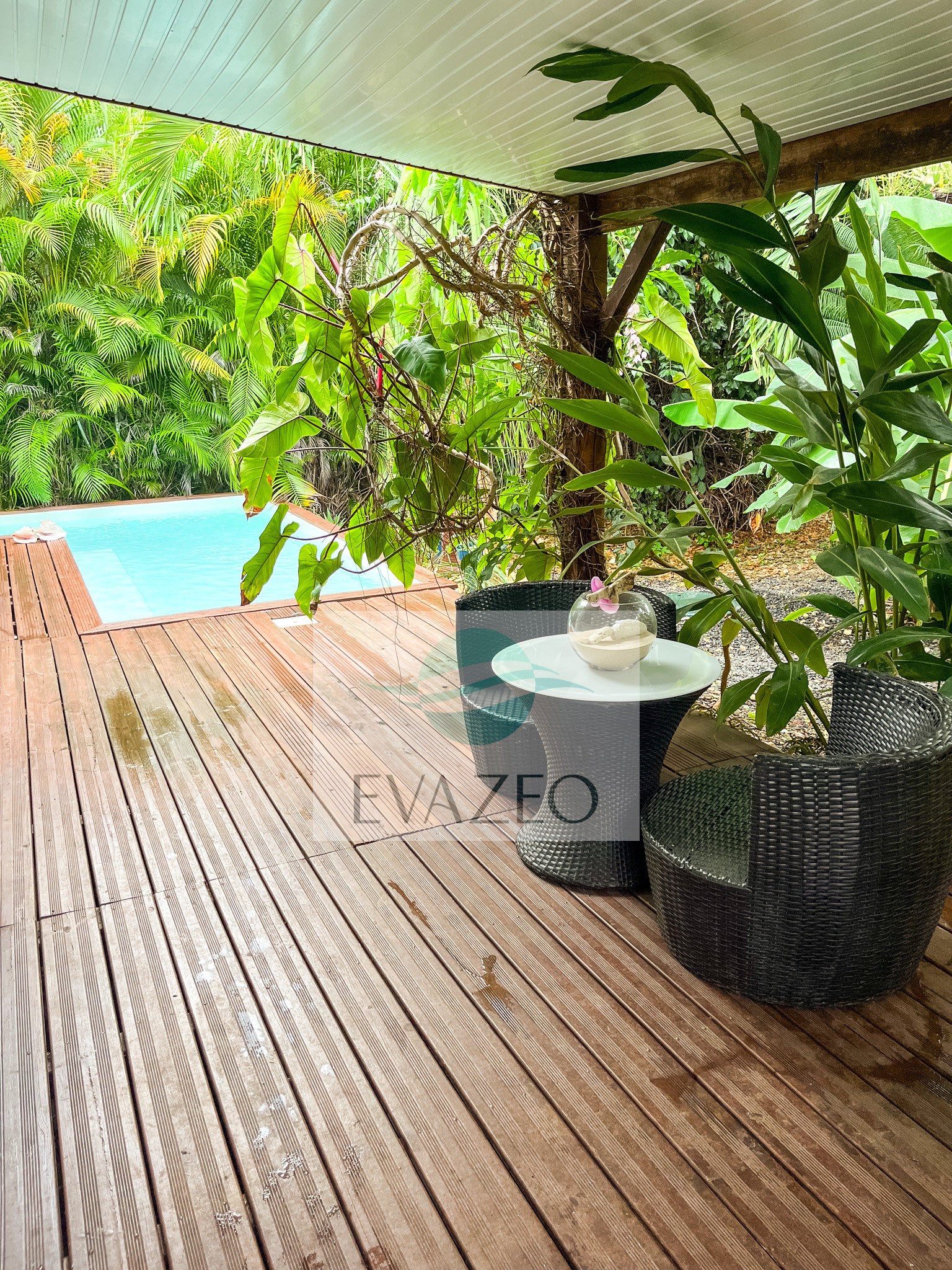 Jardin/terrasse : la villa est située sur un terrain arboré d'environ 600 m² entièrement cloturé. Terrasse de 40 m² avec salon d'extérieur complet pour les repas ou le farniente et espace barbecue.