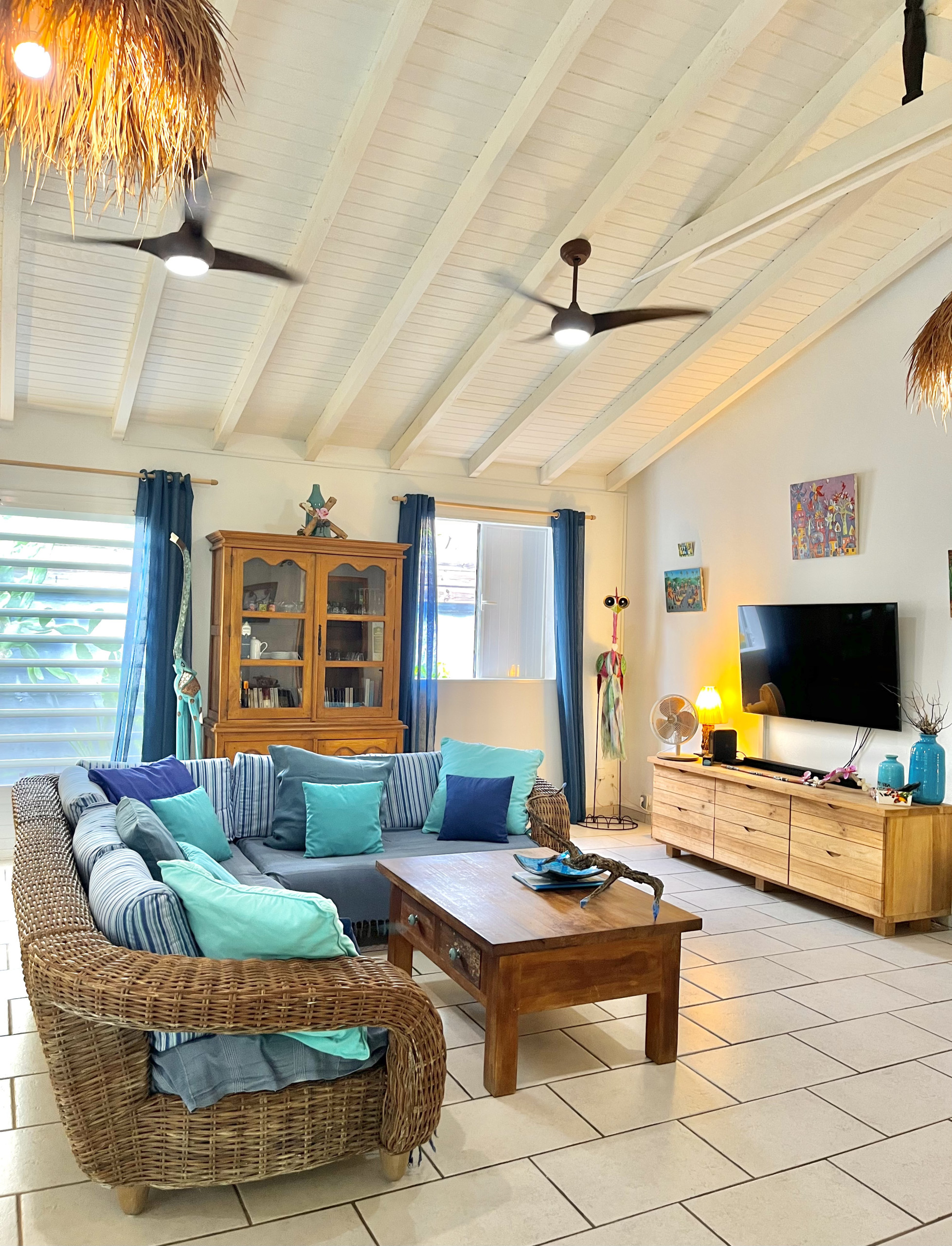 La villa dispose de deux chambres confortables pouvant accueillir jusqu'à 4 personnes et un bébé, avec un lit queen size et deux lits individuels. La climatisation dans les chambres garantira votre confort pendant les chaudes journées caribéennes. Un coffre-fort et un fer à repasser sont également à votre disposition pour plus de tranquillité.