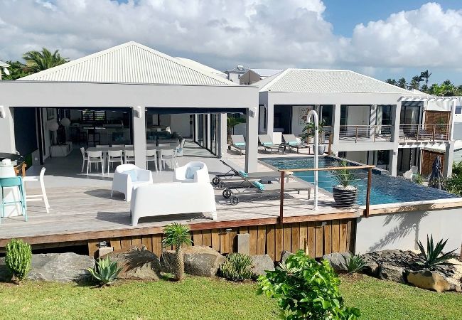 Cette magnifique villa se situe dans un secteur résidentiel à côté d'un des plus beaux hôtels de l'ile (La Toubana****). Ses volumes impressionnants, sa décoration épurée et la noblesse de ses matériaux (bois rouge, courbaril, inox...) s'inspirent des maisons de prestige de St Barth. Elle propose également un grand jardin tropical clôturé et une très belle vue sur la mer.